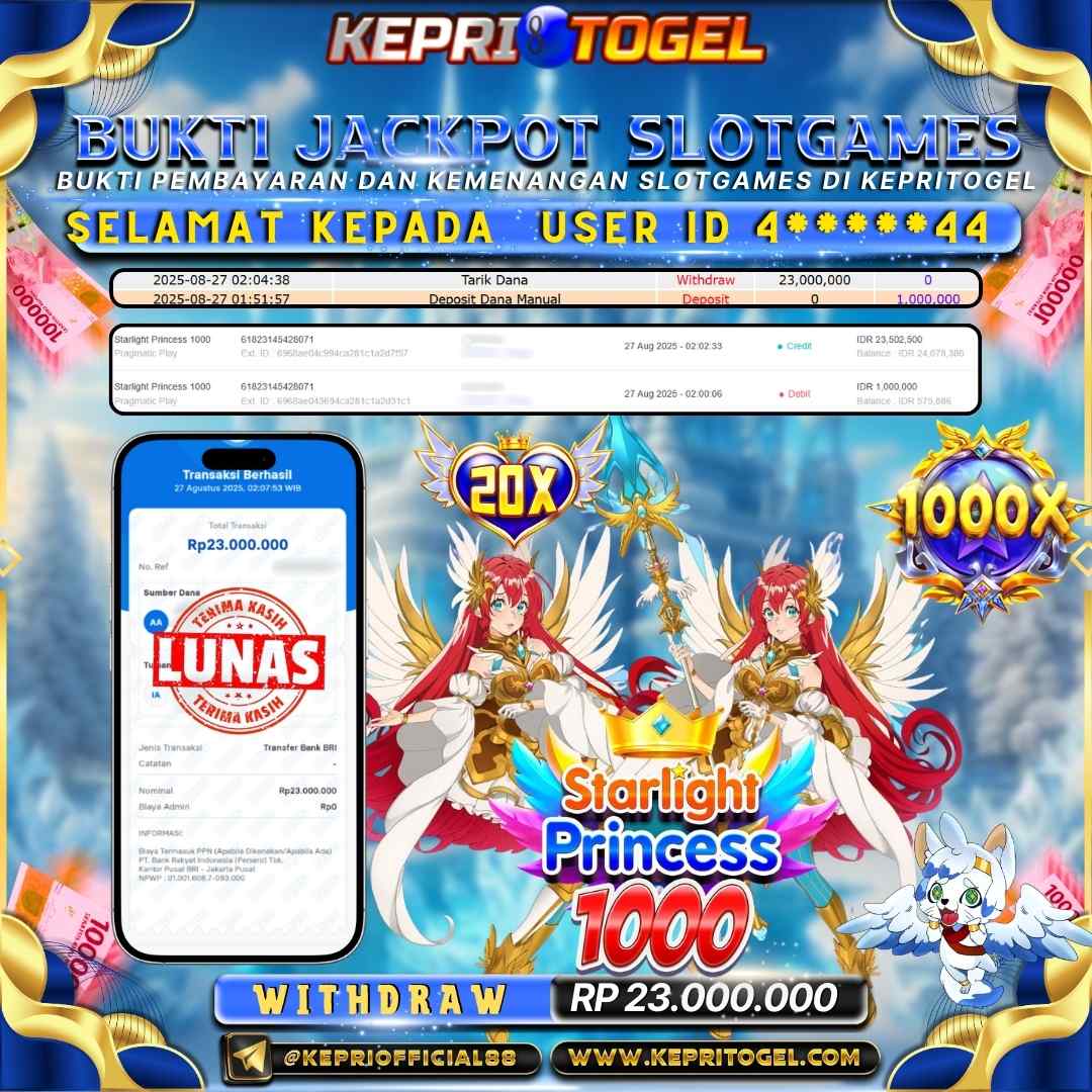 Selamat kepada UserId 4*****44 telah berhasil mendapatkan kemenangan jackpot pada permainan Slot Starlight Princess 1000 Kepritogel sebesar Rp23,000,000,-. Kepritogel situs terpercaya sejak dulu hingga saat ini , Untuk kemenangan berapapun pasti akan kami bayarkan . Jangan ragu bermain di Kepri Togel . Kami pihak Kepritogel Menyampaikan terima kasih kepada seluruh member Kepri Togel yang telah Percaya dan setia Bersama kami bermain di Kepritogel hingga saat ini.