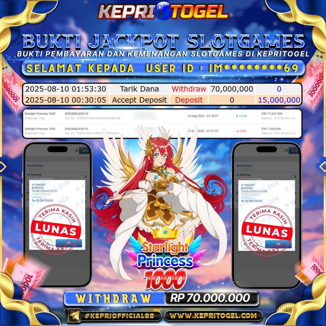 Selamat kepada UserId IM********69 telah berhasil mendapatkan kemenangan jackpot pada permainan Slot Starlight Princess 1000 Kepritogel sebesar Rp70,000,000,- . Kepritogel situs terpercaya sejak dulu hingga saat ini , Untuk kemenangan berapapun pasti akan kami bayarkan . Jangan ragu bermain di Kepri Togel . Kami pihak Kepritogel Menyampaikan terima kasih kepada seluruh member Kepri Togel yang telah Percaya dan setia Bersama kami bermain di Kepritogel hingga saat ini.