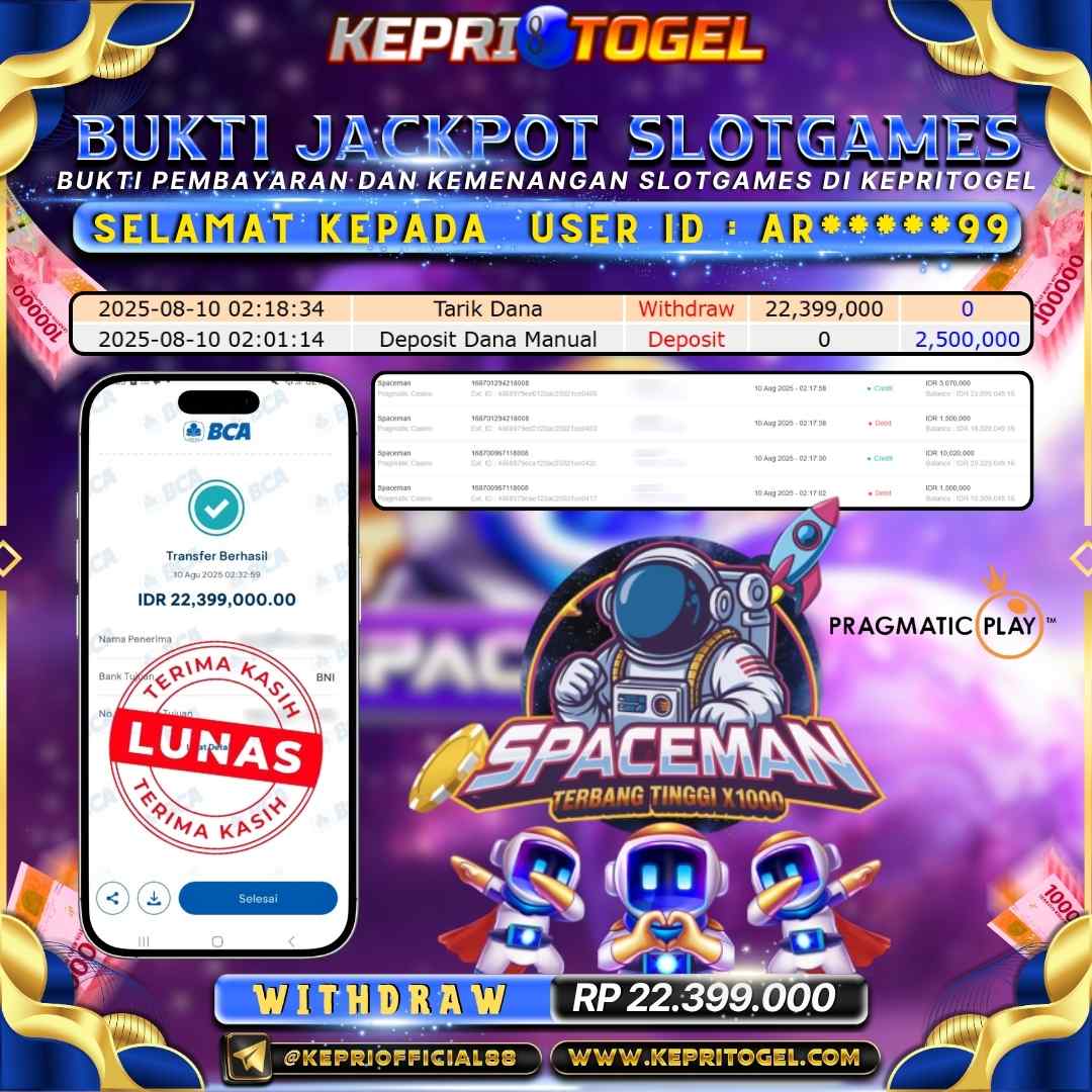 Selamat kepada UserId AR*****99 telah berhasil mendapatkan kemenangan jackpot pada permainan Slot Spaceman Kepritogel sebesar Rp22,399,000,-. Kepritogel situs terpercaya sejak dulu hingga saat ini , Untuk kemenangan berapapun pasti akan kami bayarkan . Jangan ragu bermain di Kepri Togel . Kami pihak Kepritogel Menyampaikan terima kasih kepada seluruh member Kepri Togel yang telah Percaya dan setia Bersama kami bermain di Kepritogel hingga saat ini.