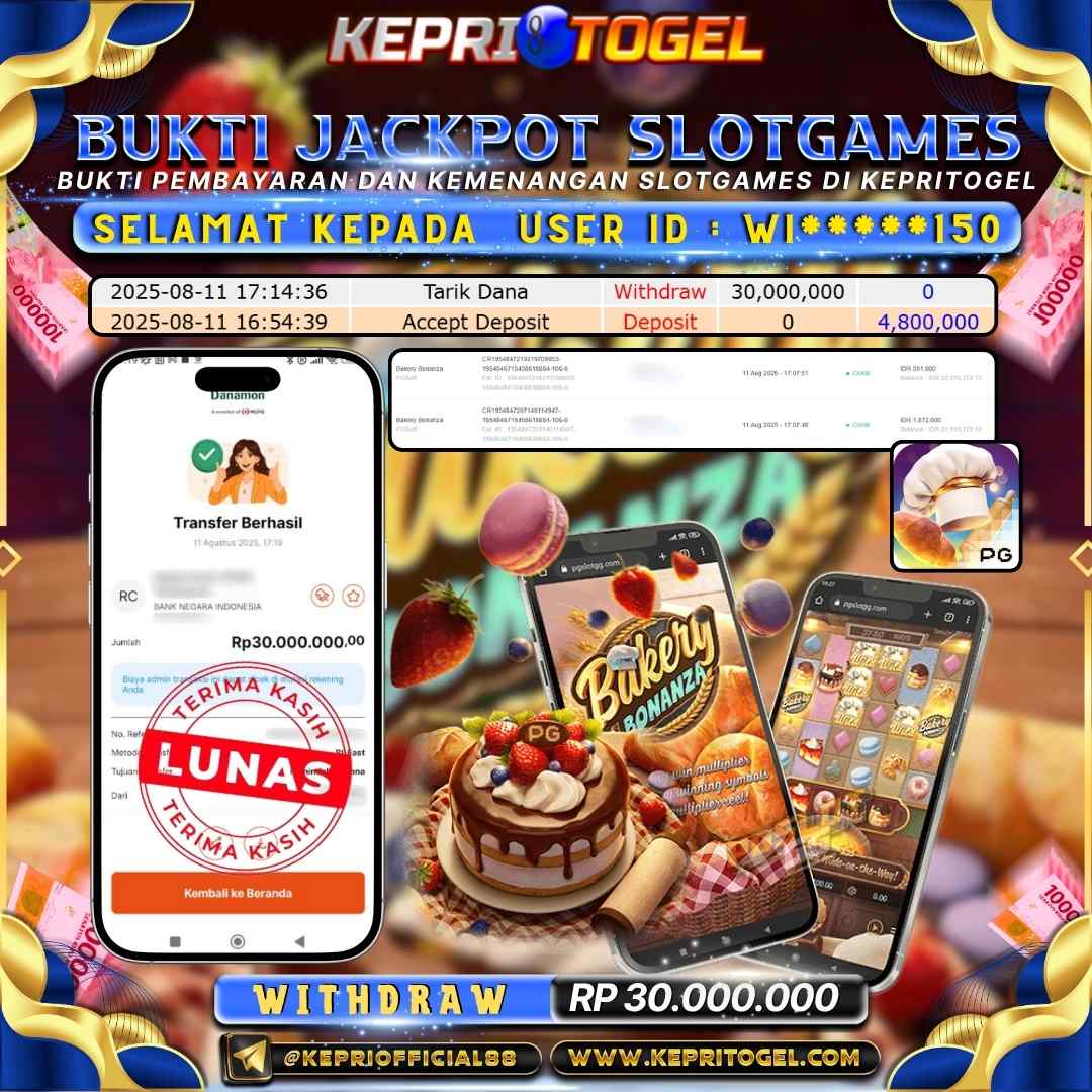 Selamat kepada UserId WI*****150 telah berhasil mendapatkan kemenangan jackpot pada permainan Slot Bakery Bonanza Kepritogel sebesar Rp30,000,000,-. Kepritogel situs terpercaya sejak dulu hingga saat ini , Untuk kemenangan berapapun pasti akan kami bayarkan . Jangan ragu bermain di Kepri Togel . Kami pihak Kepritogel Menyampaikan terima kasih kepada seluruh member Kepri Togel yang telah Percaya dan setia Bersama kami bermain di Kepritogel hingga saat ini.