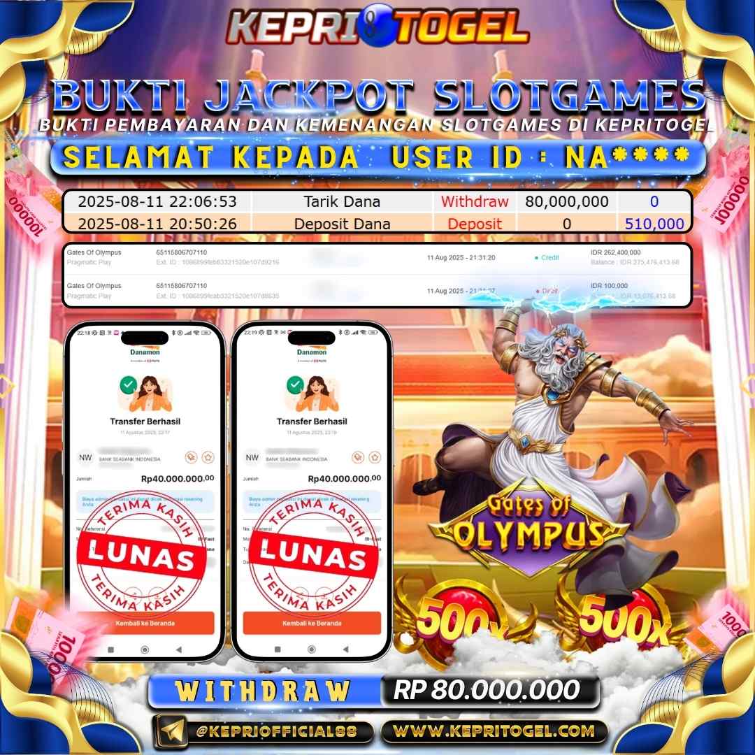 Selamat kepada UserId NA**** telah berhasil mendapatkan kemenangan jackpot pada permainan Slot Gates Of Olympus Kepritogel sebesar Rp80,000,000,-. Kepritogel situs terpercaya sejak dulu hingga saat ini , Untuk kemenangan berapapun pasti akan kami bayarkan . Jangan ragu bermain di Kepri Togel . Kami pihak Kepritogel Menyampaikan terima kasih kepada seluruh member Kepri Togel yang telah Percaya dan setia Bersama kami bermain di Kepritogel hingga saat ini.