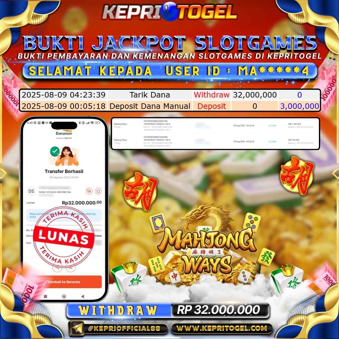 Selamat kepada UserId MA*****4 telah berhasil mendapatkan kemenangan jackpot pada permainan Slot Mahjong Ways Kepritogel sebesar Rp32,000,000,- . Kepritogel situs terpercaya sejak dulu hingga saat ini , Untuk kemenangan berapapun pasti akan kami bayarkan . Jangan ragu bermain di Kepri Togel . Kami pihak Kepritogel Menyampaikan terima kasih kepada seluruh member Kepri Togel yang telah Percaya dan setia Bersama kami bermain di Kepritogel hingga saat ini.