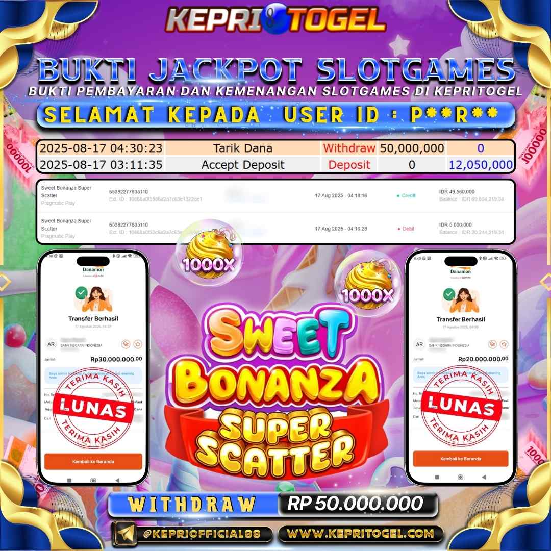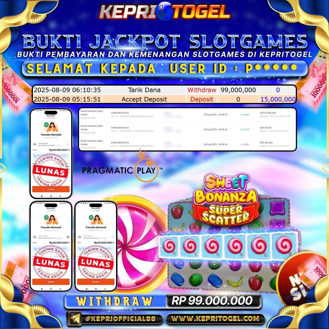Selamat kepada UserId P**R** telah berhasil mendapatkan kemenangan jackpot pada permainan Slot Sweet Bonanza Super Scatter Kepritogel sebesar Rp50,000,000,-. Kepritogel situs terpercaya sejak dulu hingga saat ini , Untuk kemenangan berapapun pasti akan kami bayarkan . Jangan ragu bermain di Kepri Togel . Kami pihak Kepritogel Menyampaikan terima kasih kepada seluruh member Kepri Togel yang telah Percaya dan setia Bersama kami bermain di Kepritogel hingga saat ini.