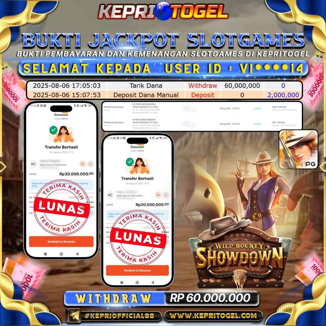 Selamat kepada UserId VI****14 telah berhasil mendapatkan kemenangan jackpot pada permainan Slot Wild Bounty Showdown Kepritogel sebesar Rp60,000,000,- . Kepritogel situs terpercaya sejak dulu hingga saat ini , Untuk kemenangan berapapun pasti akan kami bayarkan . Jangan ragu bermain di Kepri Togel . Kami pihak Kepritogel Menyampaikan terima kasih kepada seluruh member Kepri Togel yang telah Percaya dan setia Bersama kami bermain di Kepritogel hingga saat ini.