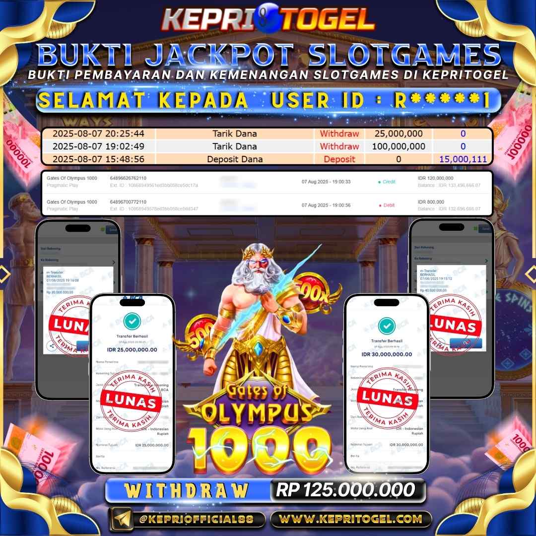 Selamat kepada UserId R*****1 telah berhasil mendapatkan kemenangan jackpot pada permainan Slot Gates of Olympus 1000 Kepritogel sebesar Rp125,000,000,-. Kepritogel situs terpercaya sejak dulu hingga saat ini , Untuk kemenangan berapapun pasti akan kami bayarkan . Jangan ragu bermain di Kepri Togel . Kami pihak Kepritogel Menyampaikan terima kasih kepada seluruh member Kepri Togel yang telah Percaya dan setia Bersama kami bermain di Kepritogel hingga saat ini.