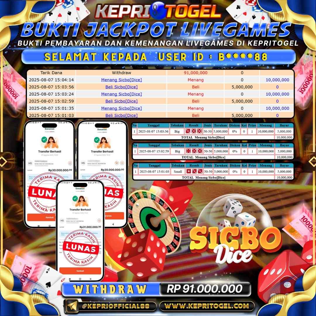 Selamat kepada UserId B****88 telah berhasil mendapatkan kemenangan jackpot pada permainan Live Game Sicbo[Dice] Kepritogel sebesar Rp91,000,000,- . Kepritogel situs terpercaya sejak dulu hingga saat ini , Untuk kemenangan berapapun pasti akan kami bayarkan . Jangan ragu bermain di Kepri Togel . Kami pihak Kepritogel Menyampaikan terima kasih kepada seluruh member Kepri Togel yang telah Percaya dan setia Bersama kami bermain di Kepritogel hingga saat ini.