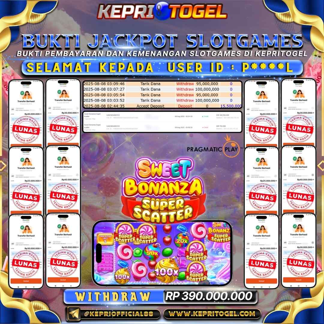 Selamat kepada UserId P****L telah berhasil mendapatkan kemenangan jackpot pada permainan Slot Sweet Bonanza Super Scatter Kepritogel sebesar Rp390,000,000,-. Kepritogel situs terpercaya sejak dulu hingga saat ini , Untuk kemenangan berapapun pasti akan kami bayarkan . Jangan ragu bermain di Kepri Togel . Kami pihak Kepritogel Menyampaikan terima kasih kepada seluruh member Kepri Togel yang telah Percaya dan setia Bersama kami bermain di Kepritogel hingga saat ini.