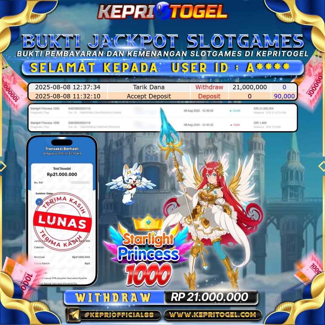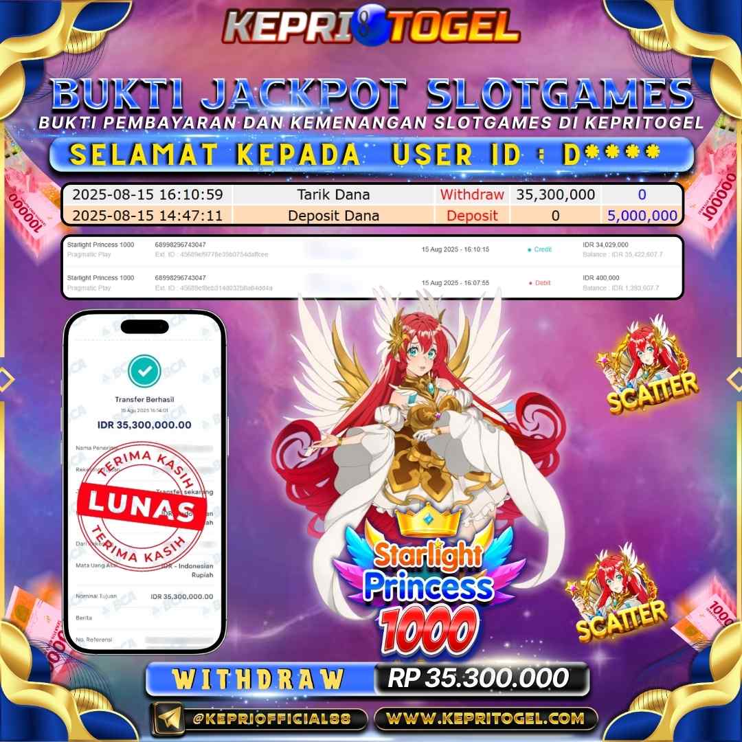 Selamat kepada UserId D**** telah berhasil mendapatkan kemenangan jackpot pada permainan Slot Starlight Princess 1000 Kepritogel sebesar Rp35,300,000,-. Kepritogel situs terpercaya sejak dulu hingga saat ini , Untuk kemenangan berapapun pasti akan kami bayarkan . Jangan ragu bermain di Kepri Togel . Kami pihak Kepritogel Menyampaikan terima kasih kepada seluruh member Kepri Togel yang telah Percaya dan setia Bersama kami bermain di Kepritogel hingga saat ini.