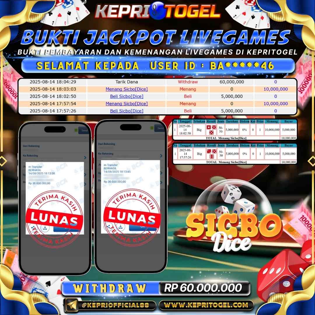 Selamat kepada UserId BA*****46 telah berhasil mendapatkan kemenangan jackpot pada permainan Live Game Sicbo[Dice] Kepritogel sebesar Rp60,000,000,- . Kepritogel situs terpercaya sejak dulu hingga saat ini , Untuk kemenangan berapapun pasti akan kami bayarkan . Jangan ragu bermain di Kepri Togel . Kami pihak Kepritogel Menyampaikan terima kasih kepada seluruh member Kepri Togel yang telah Percaya dan setia Bersama kami bermain di Kepritogel hingga saat ini.