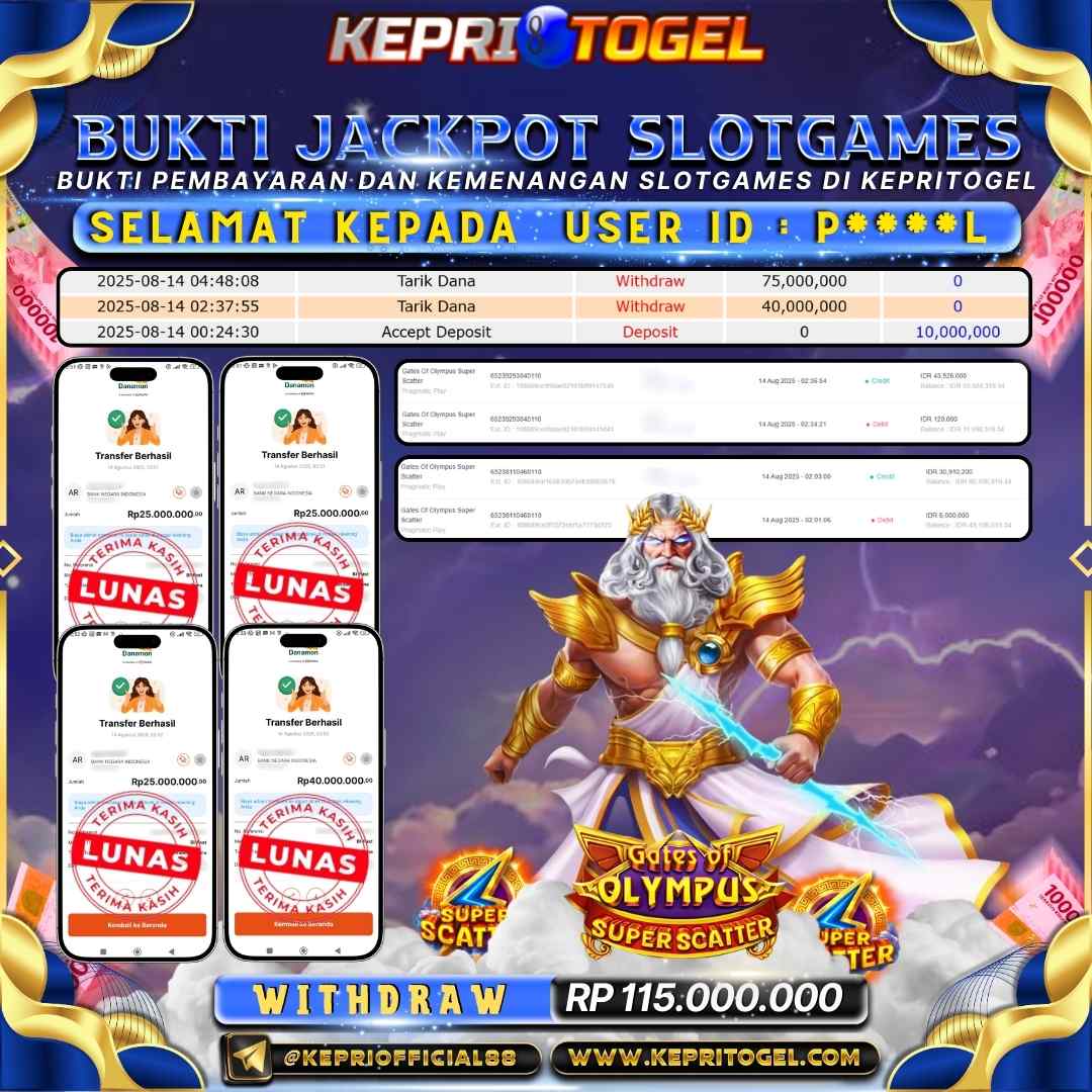 Selamat kepada UserId P****L telah berhasil mendapatkan kemenangan jackpot pada permainan Slot Gates Of Olympus Super Scatter Kepritogel sebesar Rp115,000,000,-. Kepritogel situs terpercaya sejak dulu hingga saat ini , Untuk kemenangan berapapun pasti akan kami bayarkan . Jangan ragu bermain di Kepri Togel . Kami pihak Kepritogel Menyampaikan terima kasih kepada seluruh member Kepri Togel yang telah Percaya dan setia Bersama kami bermain di Kepritogel hingga saat ini.