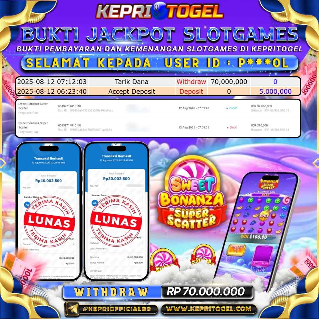 Selamat kepada UserId P***OL telah berhasil mendapatkan kemenangan jackpot pada permainan Slot Sweet Bonanza Super Scatter Kepritogel sebesar Rp70,000,000,-. Kepritogel situs terpercaya sejak dulu hingga saat ini , Untuk kemenangan berapapun pasti akan kami bayarkan . Jangan ragu bermain di Kepri Togel . Kami pihak Kepritogel Menyampaikan terima kasih kepada seluruh member Kepri Togel yang telah Percaya dan setia Bersama kami bermain di Kepritogel hingga saat ini.