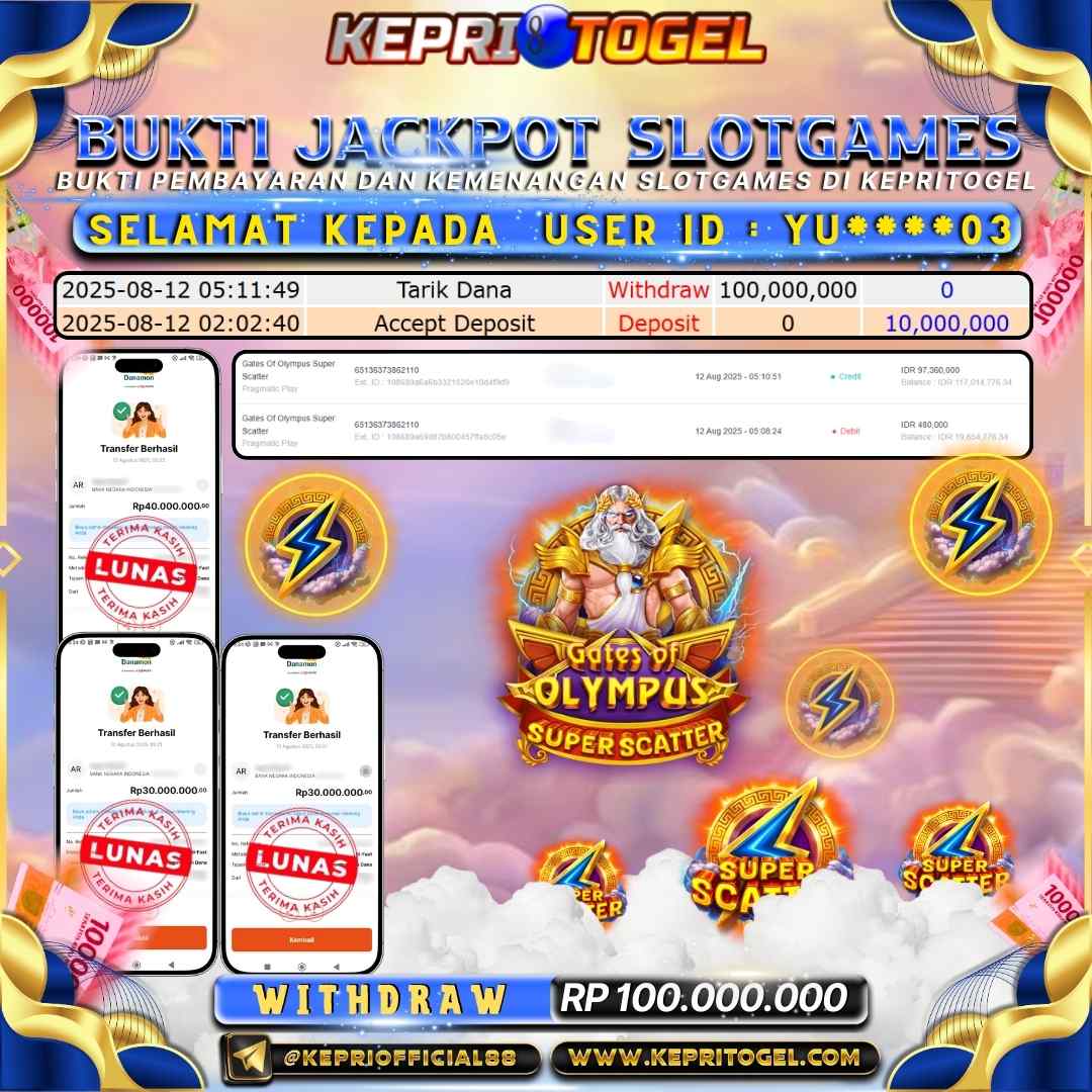 Selamat kepada UserId YU****03 telah berhasil mendapatkan kemenangan jackpot pada permainan Slot Gates Of Olympus Super Scatter Kepritogel sebesar Rp100,000,000,-. Kepritogel situs terpercaya sejak dulu hingga saat ini , Untuk kemenangan berapapun pasti akan kami bayarkan . Jangan ragu bermain di Kepri Togel . Kami pihak Kepritogel Menyampaikan terima kasih kepada seluruh member Kepri Togel yang telah Percaya dan setia Bersama kami bermain di Kepritogel hingga saat ini.