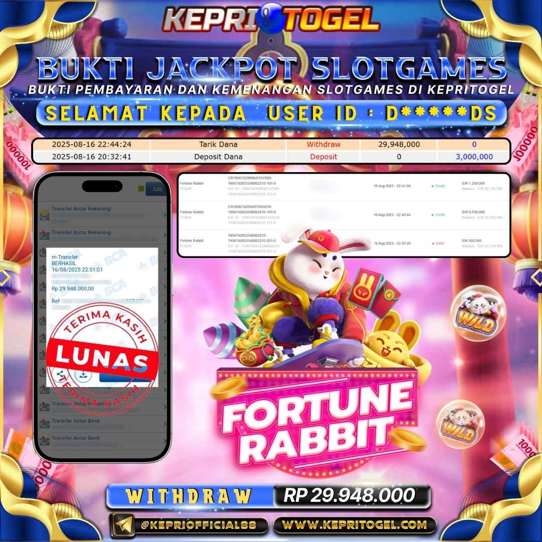 Selamat kepada UserId D*****DS telah berhasil mendapatkan kemenangan jackpot pada permainan Slot Fortune Rabbit Kepritogel sebesar Rp29,948,000,-. Kepritogel situs terpercaya sejak dulu hingga saat ini , Untuk kemenangan berapapun pasti akan kami bayarkan . Jangan ragu bermain di Kepri Togel . Kami pihak Kepritogel Menyampaikan terima kasih kepada seluruh member Kepri Togel yang telah Percaya dan setia Bersama kami bermain di Kepritogel hingga saat ini.