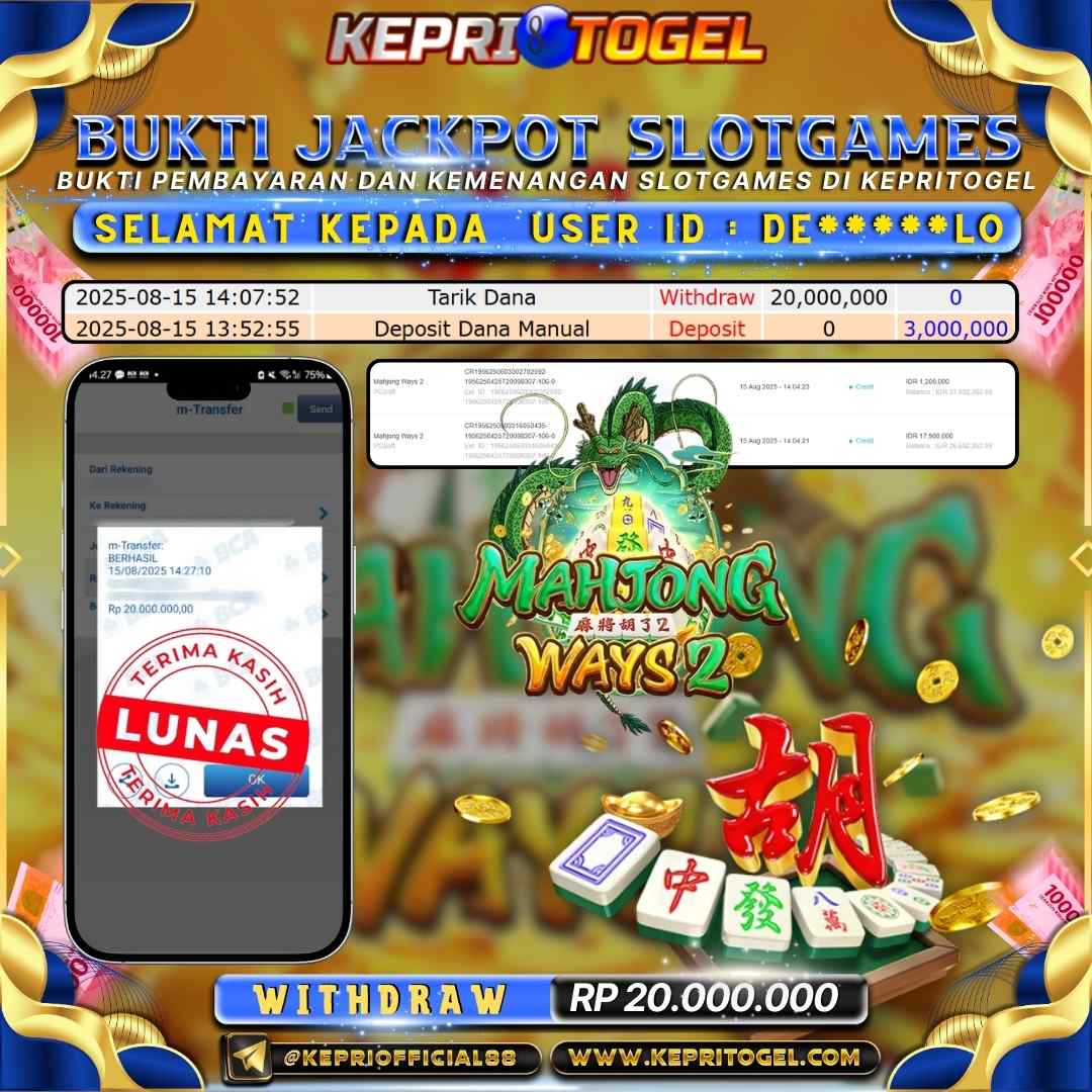 Selamat kepada UserId DE*****LO telah berhasil mendapatkan kemenangan jackpot pada permainan Slot Mahjong Ways 2 Kepritogel sebesar Rp20,000,000,-. Kepritogel situs terpercaya sejak dulu hingga saat ini , Untuk kemenangan berapapun pasti akan kami bayarkan . Jangan ragu bermain di Kepri Togel . Kami pihak Kepritogel Menyampaikan terima kasih kepada seluruh member Kepri Togel yang telah Percaya dan setia Bersama kami bermain di Kepritogel hingga saat ini.