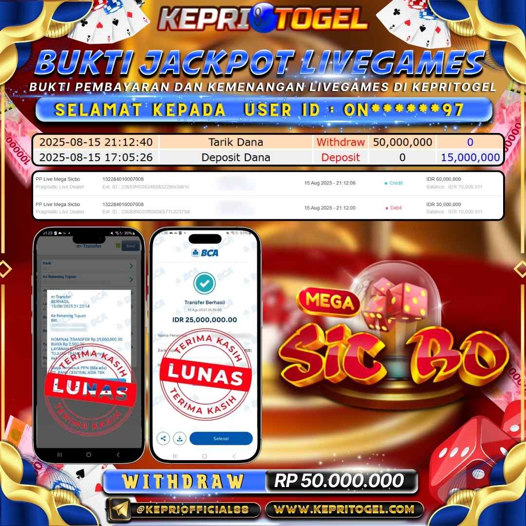 Selamat kepada UserId ON******97 telah berhasil mendapatkan kemenangan jackpot pada permainan Live Game PP Live Mega Sicbo Kepritogel sebesar Rp50,000,000,- . Kepritogel situs terpercaya sejak dulu hingga saat ini , Untuk kemenangan berapapun pasti akan kami bayarkan . Jangan ragu bermain di Kepri Togel . Kami pihak Kepritogel Menyampaikan terima kasih kepada seluruh member Kepri Togel yang telah Percaya dan setia Bersama kami bermain di Kepritogel hingga saat ini.