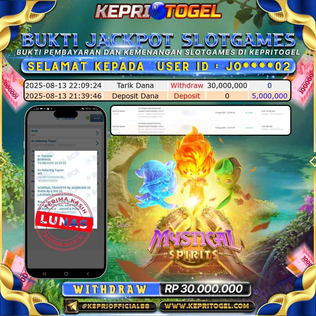 Selamat kepada UserId JO****02 telah berhasil mendapatkan kemenangan jackpot pada permainan Slot Mystical Spirits Kepritogel sebesar Rp30,000,000,-. Kepritogel situs terpercaya sejak dulu hingga saat ini , Untuk kemenangan berapapun pasti akan kami bayarkan . Jangan ragu bermain di Kepri Togel . Kami pihak Kepritogel Menyampaikan terima kasih kepada seluruh member Kepri Togel yang telah Percaya dan setia Bersama kami bermain di Kepritogel hingga saat ini.