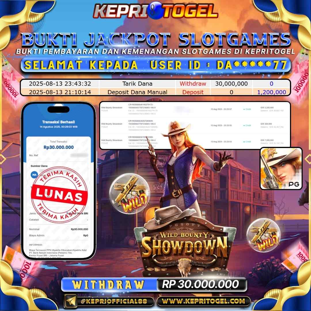 Selamat kepada UserId DA*****77 telah berhasil mendapatkan kemenangan jackpot pada permainan Slot Wild Bounty Showdown Kepritogel sebesar Rp30,000,000,- . Kepritogel situs terpercaya sejak dulu hingga saat ini , Untuk kemenangan berapapun pasti akan kami bayarkan . Jangan ragu bermain di Kepri Togel . Kami pihak Kepritogel Menyampaikan terima kasih kepada seluruh member Kepri Togel yang telah Percaya dan setia Bersama kami bermain di Kepritogel hingga saat ini.