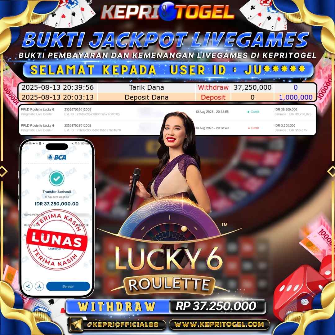 Selamat kepada UserId JU***** telah berhasil mendapatkan kemenangan jackpot pada permainan Live Game PPLD Roulette Lucky 6 Kepritogel sebesar Rp37,250,000,- . Kepritogel situs terpercaya sejak dulu hingga saat ini , Untuk kemenangan berapapun pasti akan kami bayarkan . Jangan ragu bermain di Kepri Togel . Kami pihak Kepritogel Menyampaikan terima kasih kepada seluruh member Kepri Togel yang telah Percaya dan setia Bersama kami bermain di Kepritogel hingga saat ini.