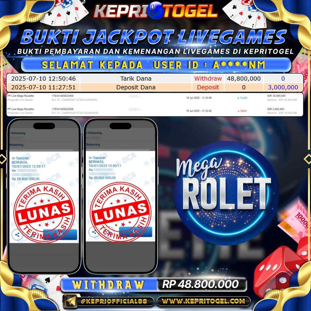 Selamat kepada UserId A****NM telah berhasil mendapatkan kemenangan jackpot pada permainan Live Game PP Live Mega Roulette Kepritogel sebesar Rp48,800,000,- . Kepritogel situs terpercaya sejak dulu hingga saat ini , Untuk kemenangan berapapun pasti akan kami bayarkan . Jangan ragu bermain di Kepri Togel . Kami pihak Kepritogel Menyampaikan terima kasih kepada seluruh member Kepri Togel yang telah Percaya dan setia Bersama kami bermain di Kepritogel hingga saat ini.