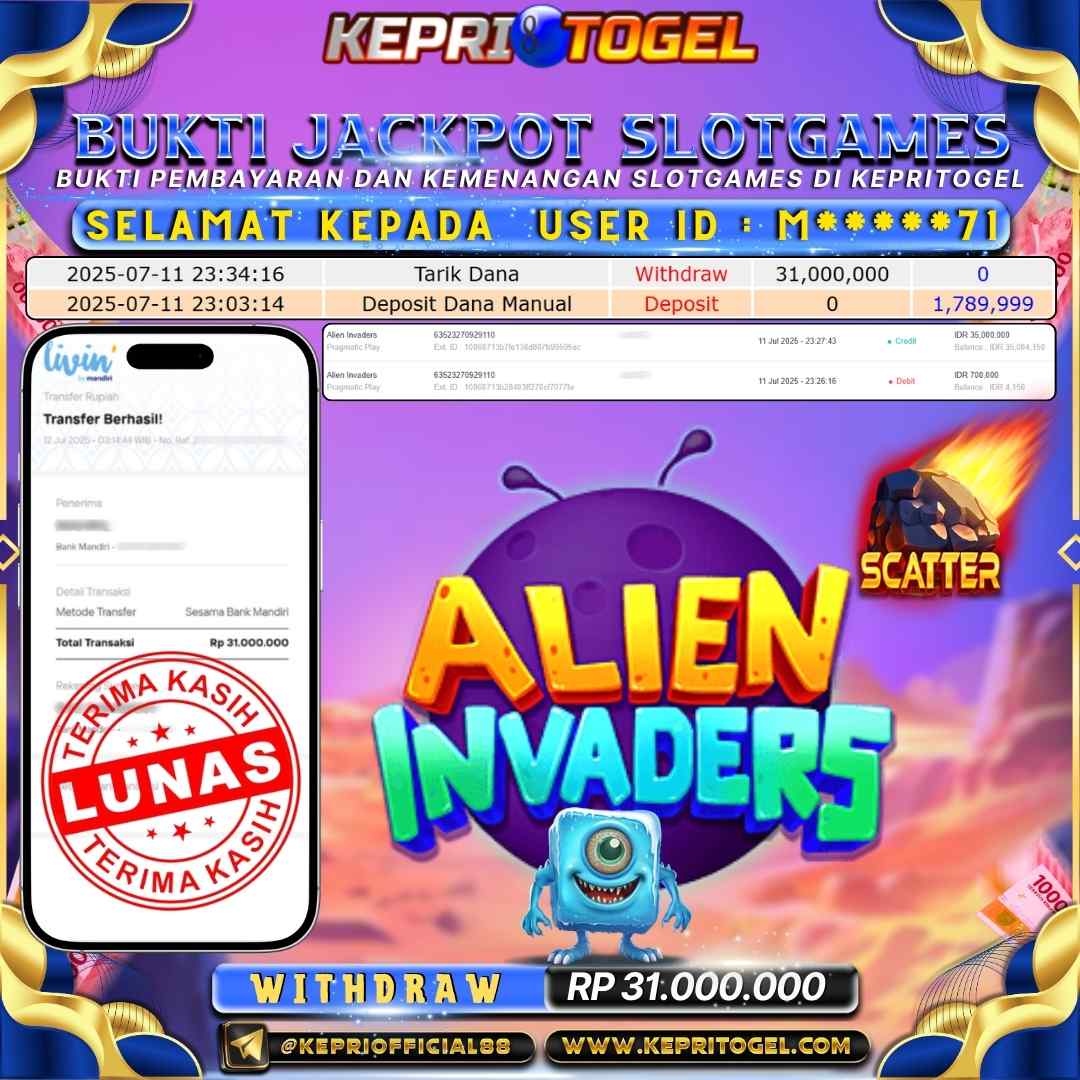 Selamat kepada UserId M*****71 telah berhasil mendapatkan kemenangan jackpot pada permainan Slot Alien Invaders Kepritogel sebesar Rp31,000,000,- . Kepritogel situs terpercaya sejak dulu hingga saat ini , Untuk kemenangan berapapun pasti akan kami bayarkan . Jangan ragu bermain di Kepri Togel . Kami pihak Kepritogel Menyampaikan terima kasih kepada seluruh member Kepri Togel yang telah Percaya dan setia Bersama kami bermain di Kepritogel hingga saat ini.