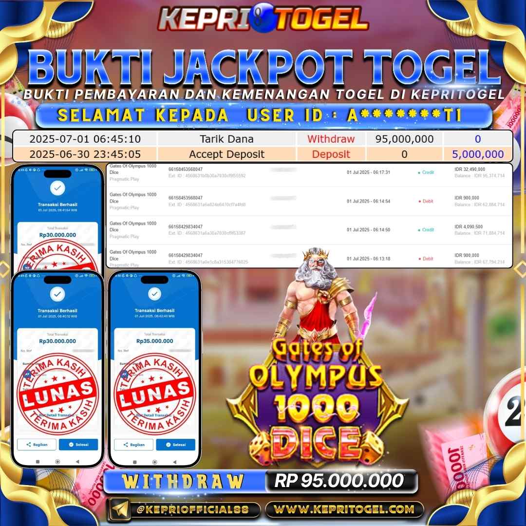 Selamat kepada UserId A*******T1 telah berhasil mendapatkan kemenangan jackpot pada permainan Slot Gates Of Olympus 1000 Dice Kepritogel sebesar Rp95,000,000,- . Kepritogel situs terpercaya sejak dulu hingga saat ini , Untuk kemenangan berapapun pasti akan kami bayarkan . Jangan ragu bermain di Kepri Togel . Kami pihak Kepritogel Menyampaikan terima kasih kepada seluruh member Kepri Togel yang telah Percaya dan setia Bersama kami bermain di Kepritogel hingga saat ini.