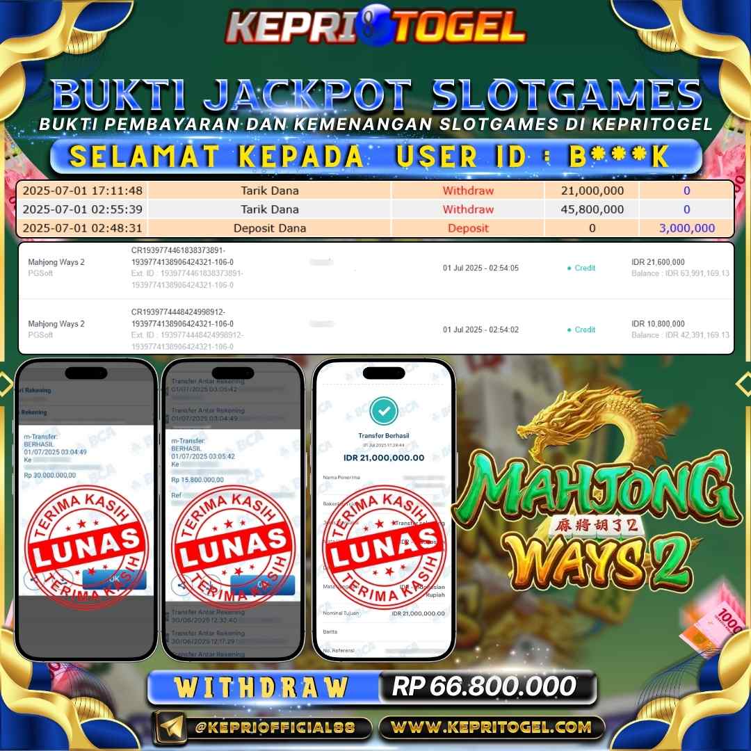 Selamat kepada UserId B***K telah berhasil mendapatkan kemenangan jackpot pada permainan Slot Mahjong Ways 2 Kepritogel sebesar Rp66,800,000,- . Kepritogel situs terpercaya sejak dulu hingga saat ini , Untuk kemenangan berapapun pasti akan kami bayarkan . Jangan ragu bermain di Kepri Togel . Kami pihak Kepritogel Menyampaikan terima kasih kepada seluruh member Kepri Togel yang telah Percaya dan setia Bersama kami bermain di Kepritogel hingga saat ini.
