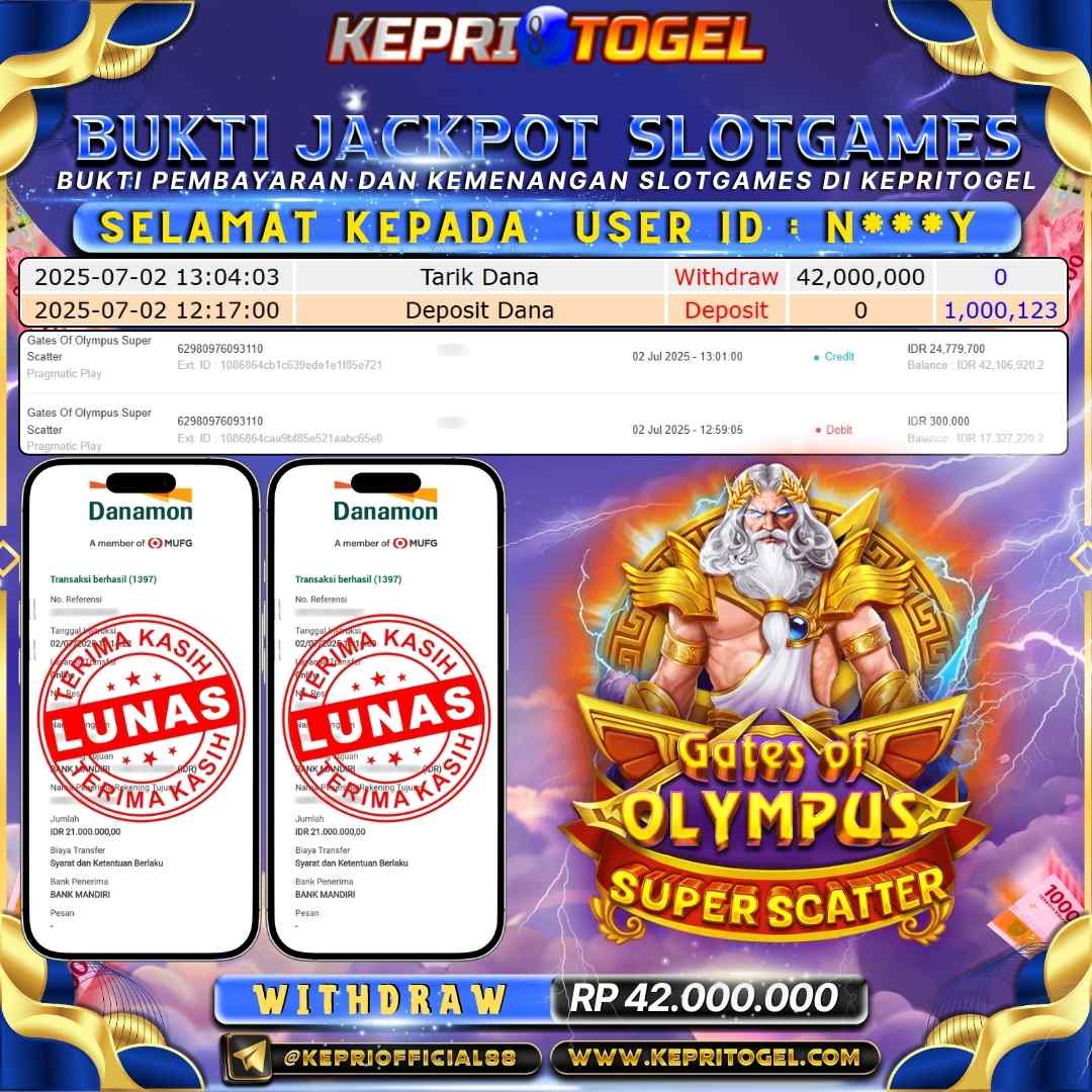 Selamat kepada UserId N***Y telah berhasil mendapatkan kemenangan jackpot pada permainan Slot Gates Of Olympus Super Scatter Kepritogel sebesar Rp42,000,000,- . Kepritogel situs terpercaya sejak dulu hingga saat ini , Untuk kemenangan berapapun pasti akan kami bayarkan . Jangan ragu bermain di Kepri Togel . Kami pihak Kepritogel Menyampaikan terima kasih kepada seluruh member Kepri Togel yang telah Percaya dan setia Bersama kami bermain di Kepritogel hingga saat ini.