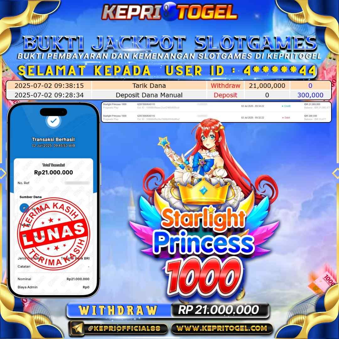 Selamat kepada UserId 4*****44 telah berhasil mendapatkan kemenangan jackpot pada permainan Slot Starlight Princess 1000 Kepritogel sebesar Rp21,000,000,- . Kepritogel situs terpercaya sejak dulu hingga saat ini , Untuk kemenangan berapapun pasti akan kami bayarkan . Jangan ragu bermain di Kepri Togel . Kami pihak Kepritogel Menyampaikan terima kasih kepada seluruh member Kepri Togel yang telah Percaya dan setia Bersama kami bermain di Kepritogel hingga saat ini.
