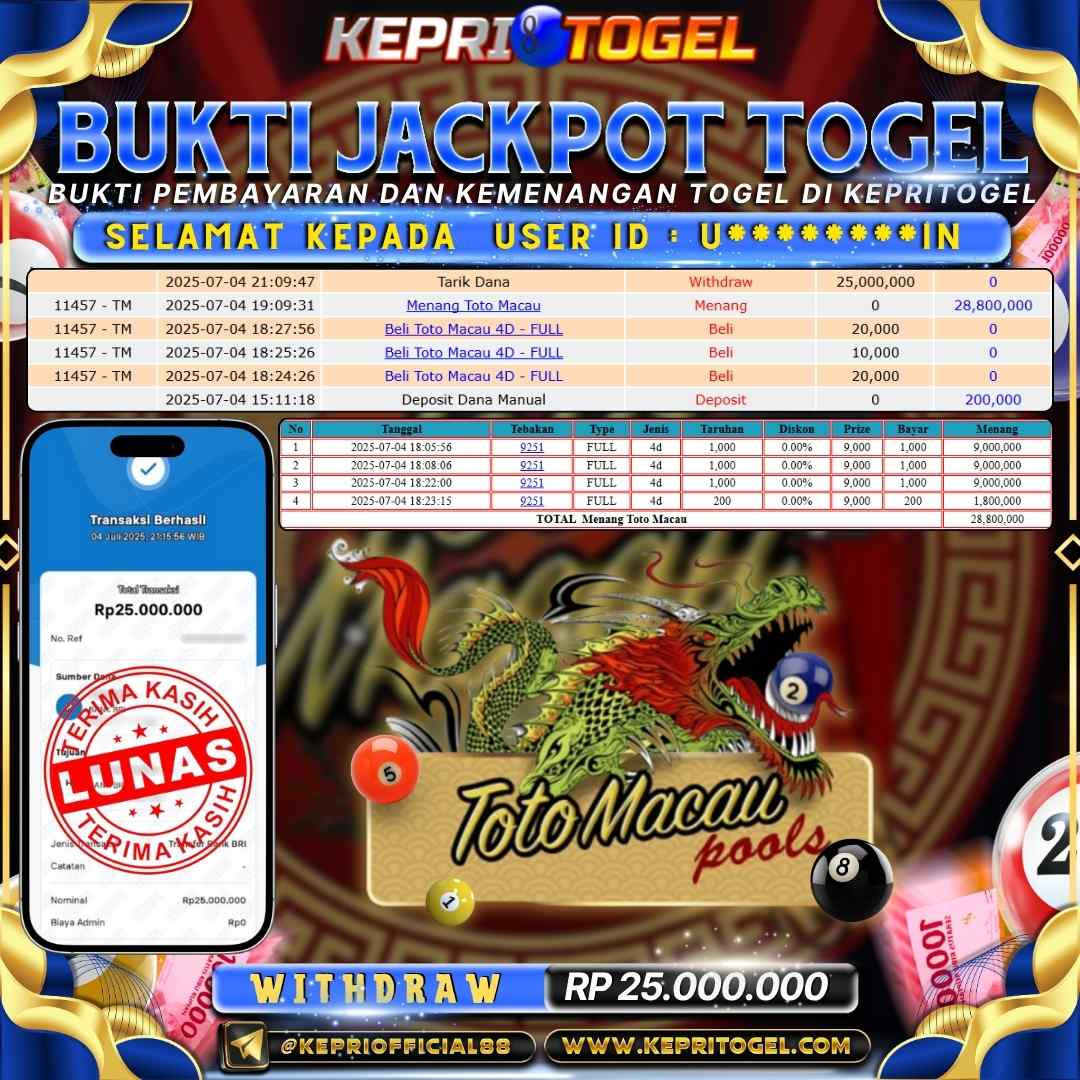 Kepritogel Jackpot Togel TOTO MACAU 4D Rp 25,000,000