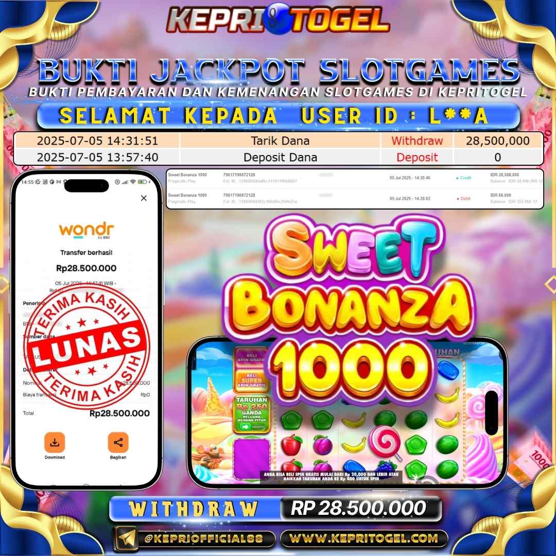 Selamat kepada UserId L**A telah berhasil mendapatkan kemenangan jackpot pada permainan Slot Sweet Bonanza 1000 Kepritogel sebesar Rp28,500,000,- . Kepritogel situs terpercaya sejak dulu hingga saat ini , Untuk kemenangan berapapun pasti akan kami bayarkan . Jangan ragu bermain di Kepri Togel . Kami pihak Kepritogel Menyampaikan terima kasih kepada seluruh member Kepri Togel yang telah Percaya dan setia Bersama kami bermain di Kepritogel hingga saat ini.