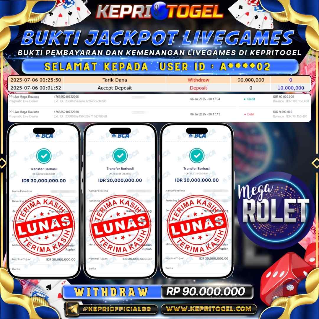 Selamat kepada UserId A****02 telah berhasil mendapatkan kemenangan jackpot pada permainan Live Game PP Live Mega Roulette Kepritogel sebesar Rp90,000,000,- . Kepritogel situs terpercaya sejak dulu hingga saat ini , Untuk kemenangan berapapun pasti akan kami bayarkan . Jangan ragu bermain di Kepri Togel . Kami pihak Kepritogel Menyampaikan terima kasih kepada seluruh member Kepri Togel yang telah Percaya dan setia Bersama kami bermain di Kepritogel hingga saat ini.