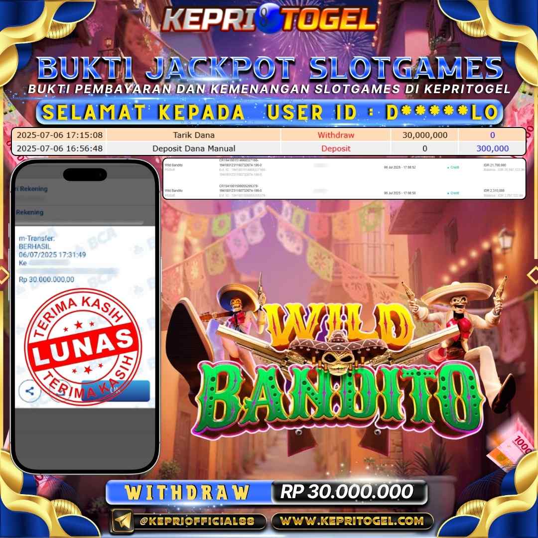 Selamat kepada UserId D*****LO telah berhasil mendapatkan kemenangan jackpot pada permainan Slot Wild Bandito Kepritogel sebesar Rp30,000,000,- . Kepritogel situs terpercaya sejak dulu hingga saat ini , Untuk kemenangan berapapun pasti akan kami bayarkan . Jangan ragu bermain di Kepri Togel . Kami pihak Kepritogel Menyampaikan terima kasih kepada seluruh member Kepri Togel yang telah Percaya dan setia Bersama kami bermain di Kepritogel hingga saat ini.