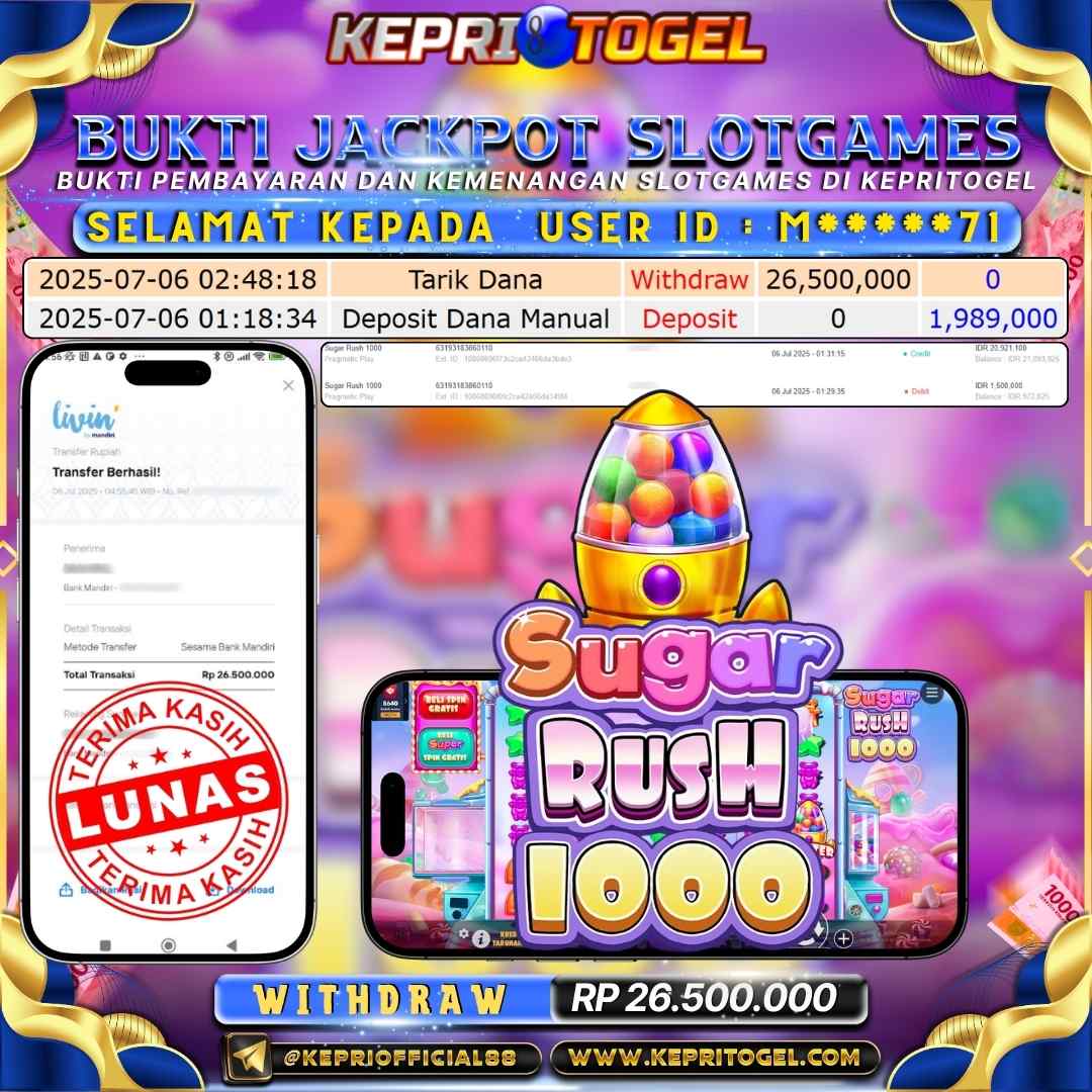 Selamat kepada UserId M*****71 telah berhasil mendapatkan kemenangan jackpot pada permainan Slot Sugar Rush 1000 Kepritogel sebesar Rp26,500,000,- . Kepritogel situs terpercaya sejak dulu hingga saat ini , Untuk kemenangan berapapun pasti akan kami bayarkan . Jangan ragu bermain di Kepri Togel . Kami pihak Kepritogel Menyampaikan terima kasih kepada seluruh member Kepri Togel yang telah Percaya dan setia Bersama kami bermain di Kepritogel hingga saat ini.