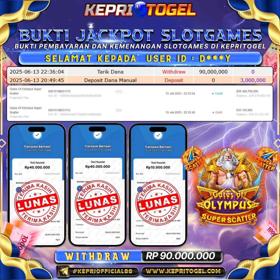 Selamat kepada UserId D***Y telah berhasil mendapatkan kemenangan jackpot pada permainan Slot Gates Of Olympus Super Scatter Kepritogel sebesar Rp90,000,000,- . Kepritogel situs terpercaya sejak dulu hingga saat ini , Untuk kemenangan berapapun pasti akan kami bayarkan . Jangan ragu bermain di Kepri Togel . Kami pihak Kepritogel Menyampaikan terima kasih kepada seluruh member Kepri Togel yang telah Percaya dan setia Bersama kami bermain di Kepritogel hingga saat ini.