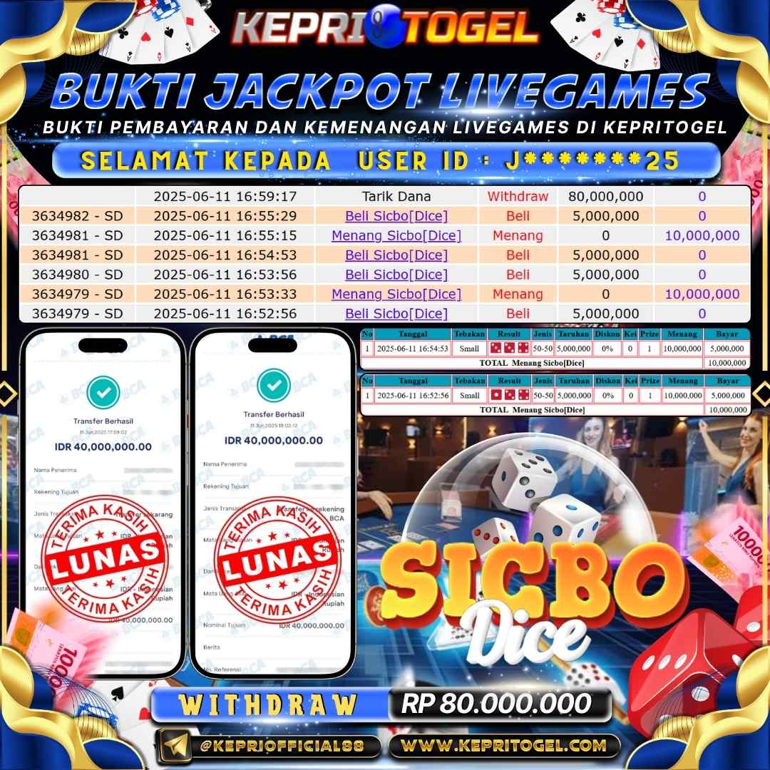 Kepritogel Jackpot Live Game SICBO ( DICE ) Rp80.000.000