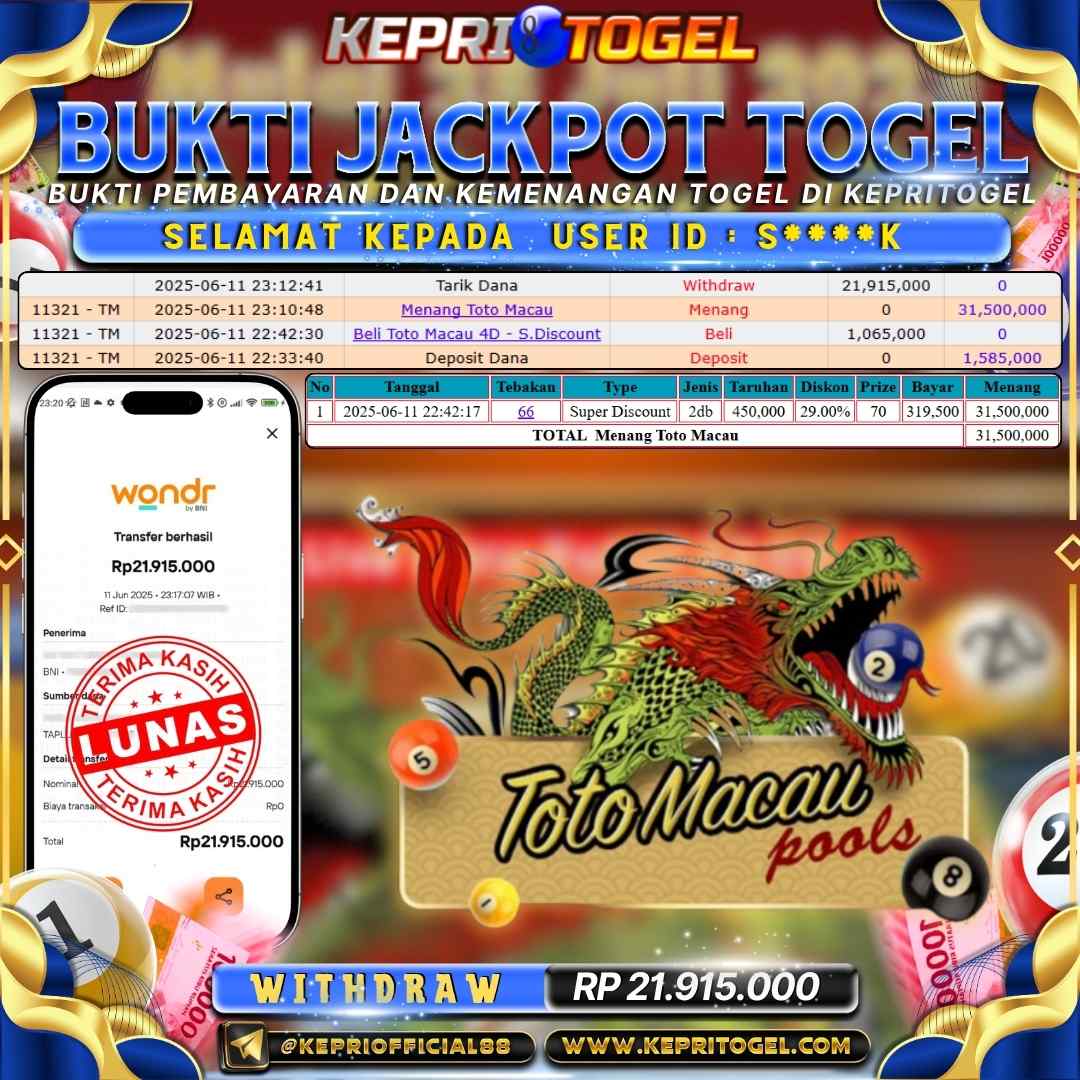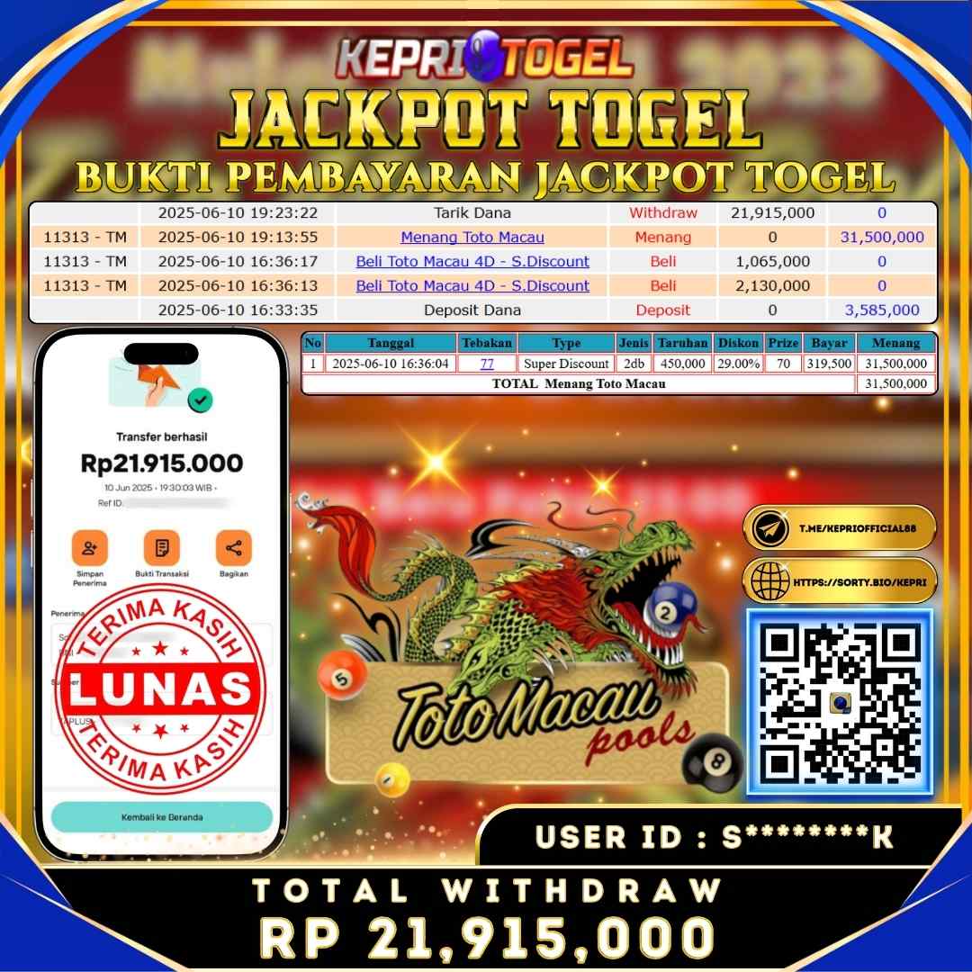 Kepritogel Jackpot Togel TOTO MACAU 4D Rp21,915,000