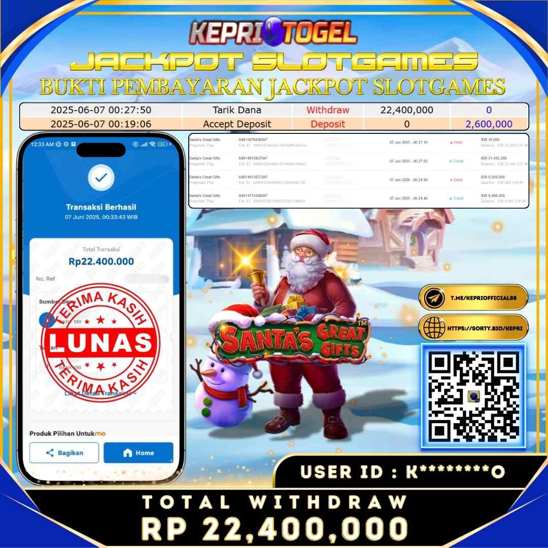 Selamat kepada UserId K********O telah berhasil mendapatkan kemenangan jackpot pada permainan Slot Santa's Great Gifts Kepritogel sebesar Rp22,400,000,- . Kepritogel situs terpercaya sejak dulu hingga saat ini , Untuk kemenangan berapapun pasti akan kami bayarkan . Jangan ragu bermain di Kepri Togel . Kami pihak Kepritogel Menyampaikan terima kasih kepada seluruh member Kepri Togel yang telah Percaya dan setia Bersama kami bermain di Kepritogel hingga saat ini.