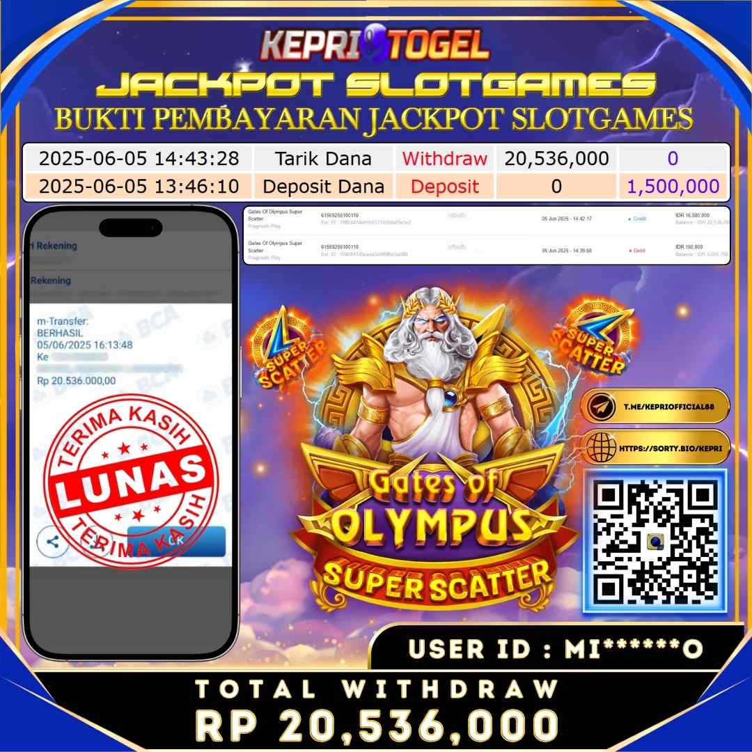 Selamat kepada UserId MI******OP telah berhasil mendapatkan kemenangan jackpot pada permainan Slot Gates Of Olympus Super Scatter Kepritogel sebesar Rp20,536,000,- . Kepritogel situs terpercaya sejak dulu hingga saat ini , Untuk kemenangan berapapun pasti akan kami bayarkan . Jangan ragu bermain di Kepri Togel . Kami pihak Kepritogel Menyampaikan terima kasih kepada seluruh member Kepri Togel yang telah Percaya dan setia Bersama kami bermain di Kepritogel hingga saat ini.