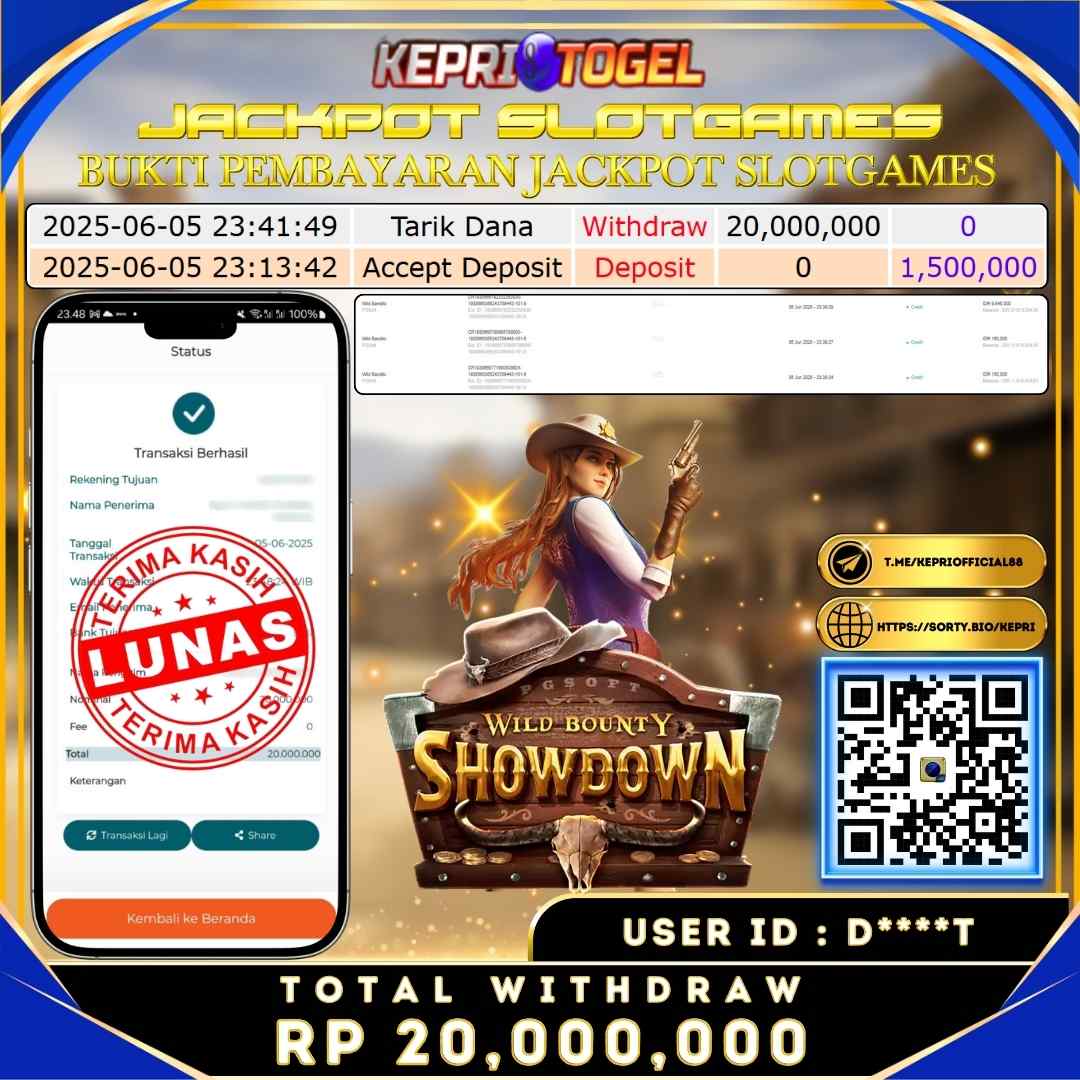 Selamat kepada UserId D****T telah berhasil mendapatkan kemenangan jackpot pada permainan Slot Wild Bounty Showdown Kepritogel sebesar Rp20,000,000,- . Kepritogel situs terpercaya sejak dulu hingga saat ini , Untuk kemenangan berapapun pasti akan kami bayarkan . Jangan ragu bermain di Kepri Togel . Kami pihak Kepritogel Menyampaikan terima kasih kepada seluruh member Kepri Togel yang telah Percaya dan setia Bersama kami bermain di Kepritogel hingga saat ini.
