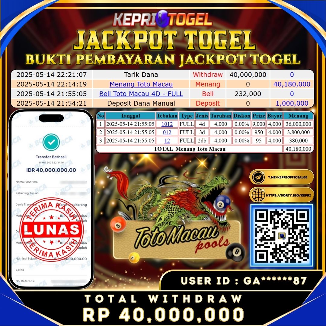 Kepritogel Jackpot Togel TOTO MACAU 4D Rp40,000,000