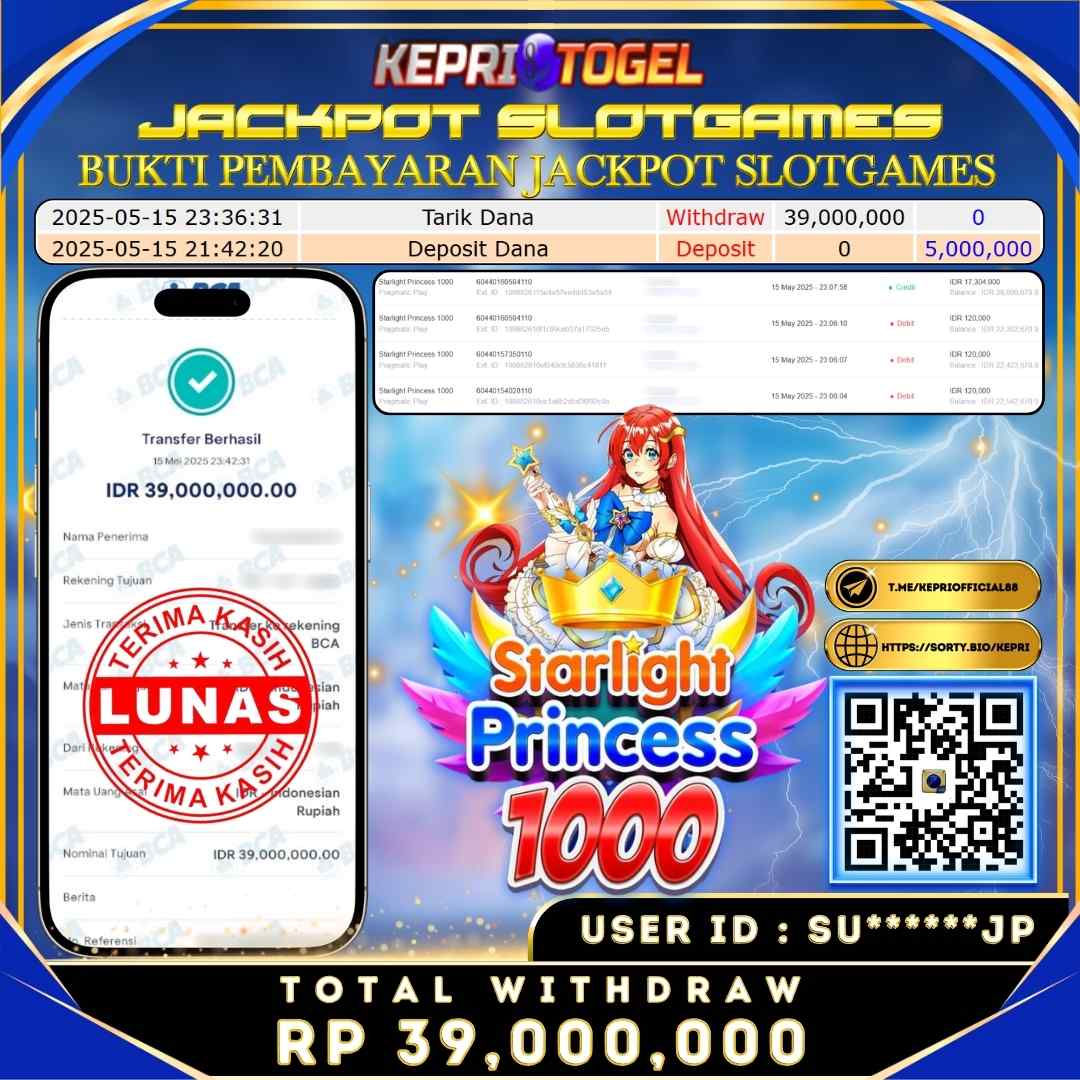 Selamat kepada UserId SU******JP telah berhasil mendapatkan kemenangan jackpot pada permainan Slot Starlight Princess 1000 Kepritogel sebesar Rp39,000,000,- . Kepritogel situs terpercaya sejak dulu hingga saat ini , Untuk kemenangan berapapun pasti akan kami bayarkan . Jangan ragu bermain di Kepri Togel . Kami pihak Kepritogel Menyampaikan terima kasih kepada seluruh member Kepri Togel yang telah Percaya dan setia Bersama kami bermain di Kepritogel hingga saat ini.