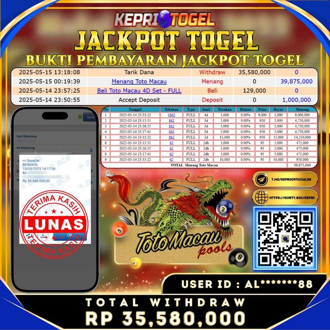 Kepritogel Jackpot Togel TOTO MACAU 4D Rp35,580,000