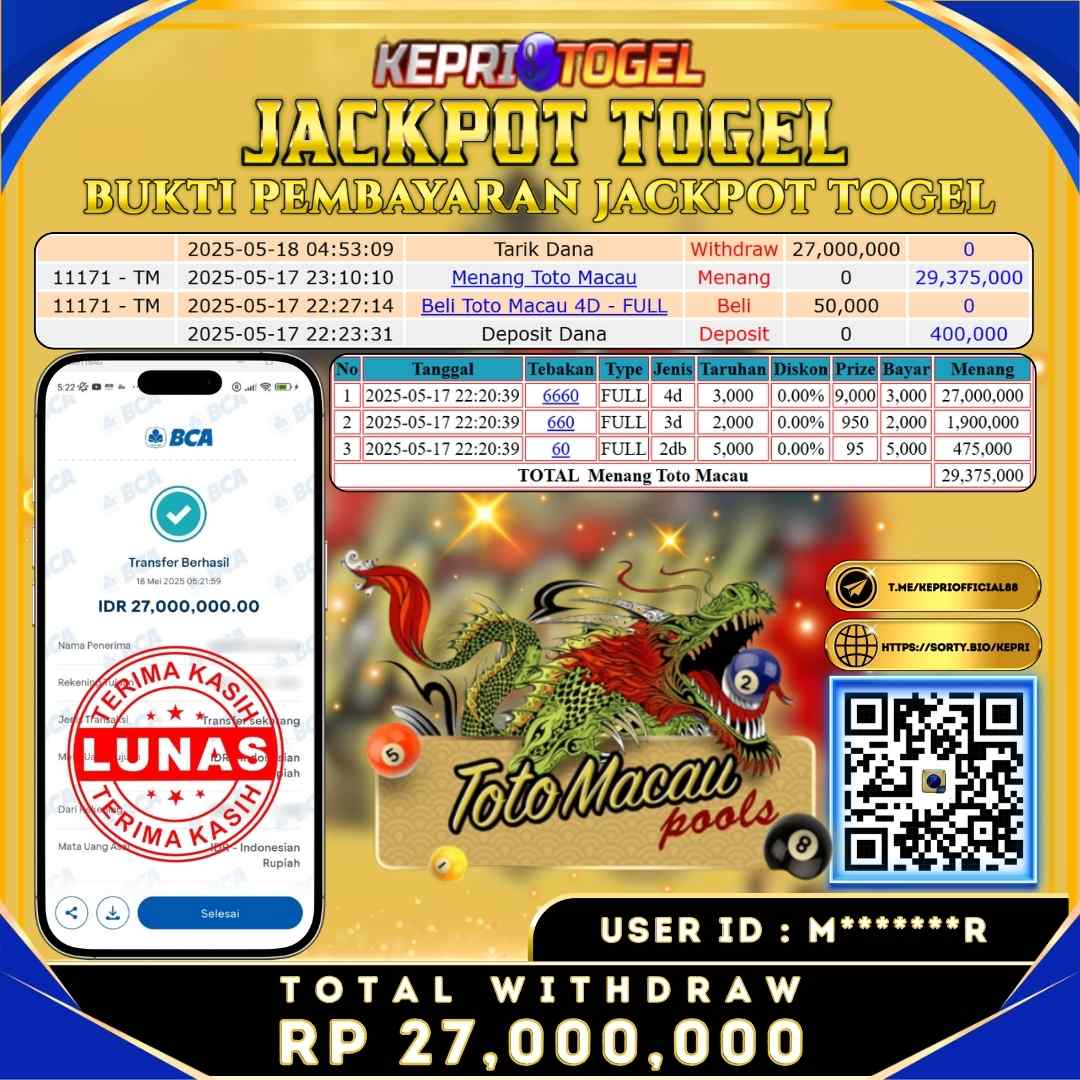 Kepritogel Jackpot Togel TOTO MACAU 4D Rp27,000,000