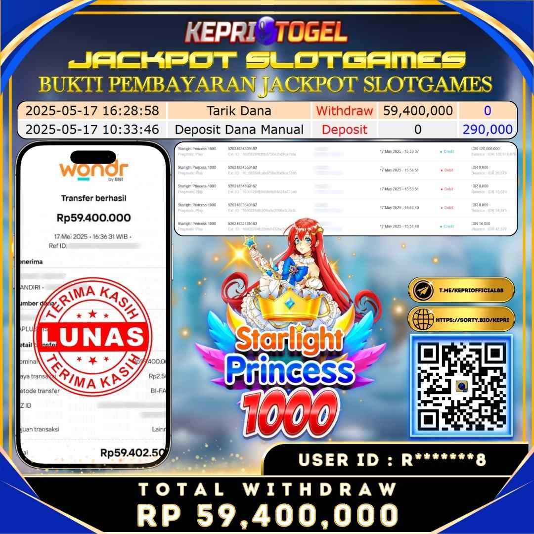 Kepritogel Jackpot Slot Starlight Princess 1000 Rp59,400,000