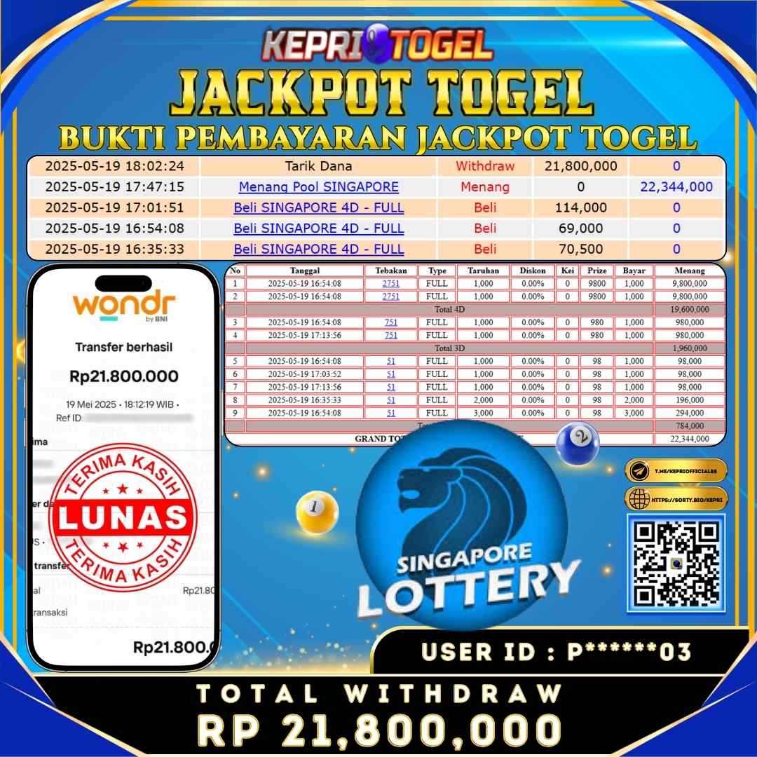 Kepritogel Jackpot Togel SINGAPORE POOLS Rp21,800,000
