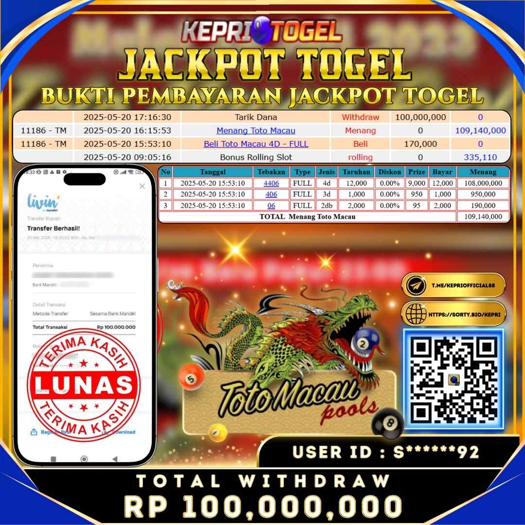 Kepritogel Jackpot Togel TOTO MACAU 4D Rp100,000,000