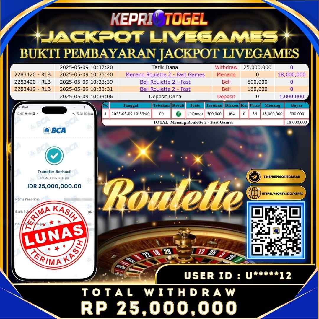 Selamat kepada UserId U*****12 telah berhasil mendapatkan kemenangan jackpot pada permainan Live Game ROULETTE Kepritogel sebesar Rp25,000,000,- . Kepritogel situs terpercaya sejak dulu hingga saat ini , Untuk kemenangan berapapun pasti akan kami bayarkan . Jangan ragu bermain di Kepri Togel . Kami pihak Kepritogel Menyampaikan terima kasih kepada seluruh member Kepri Togel yang telah Percaya dan setia Bersama kami bermain di Kepritogel hingga saat ini.