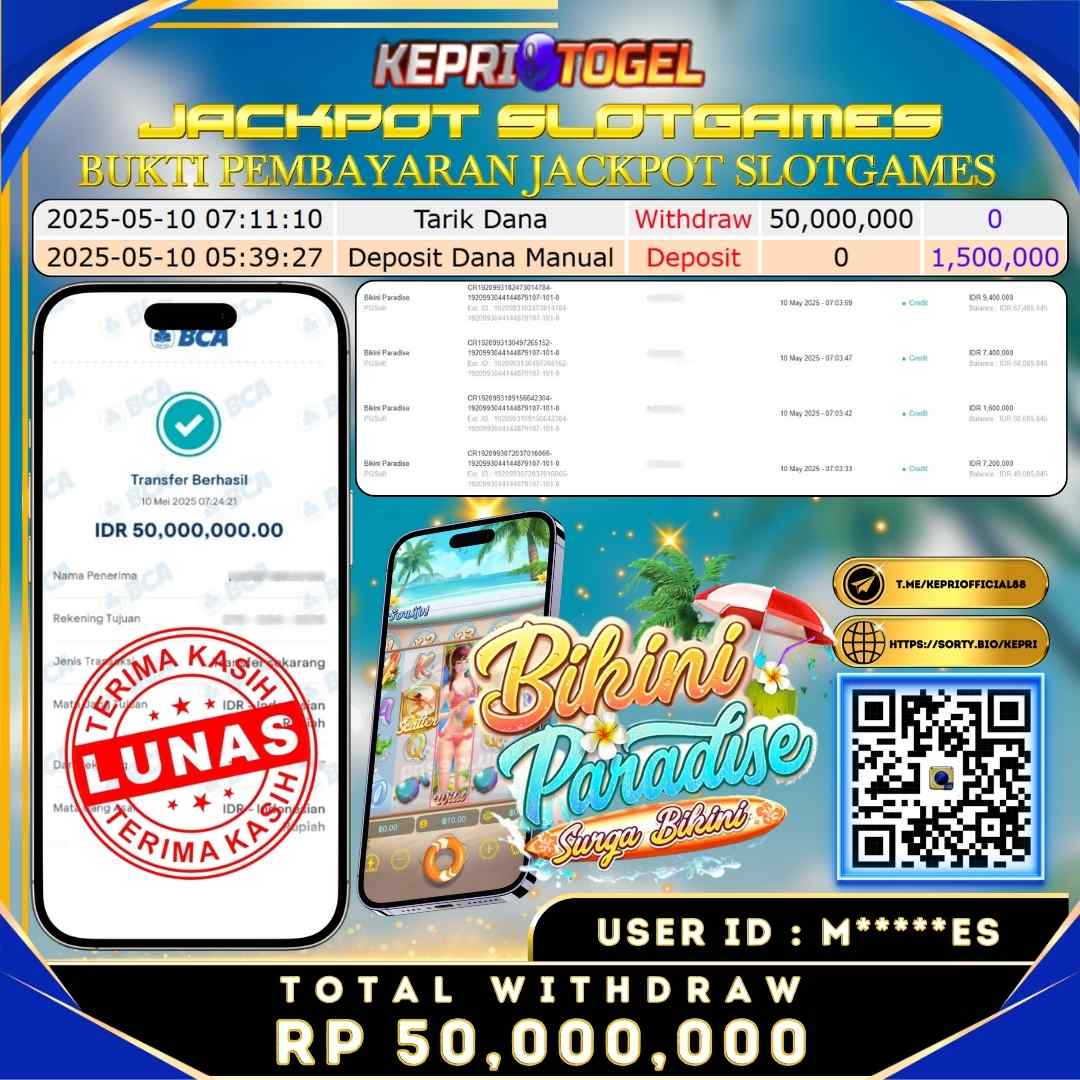 Selamat kepada UserId M*****ES telah berhasil mendapatkan kemenangan jackpot pada permainan Slot Bikini Paradise Kepritogel sebesar Rp50,000,000,- . Kepritogel situs terpercaya sejak dulu hingga saat ini , Untuk kemenangan berapapun pasti akan kami bayarkan . Jangan ragu bermain di Kepri Togel . Kami pihak Kepritogel Menyampaikan terima kasih kepada seluruh member Kepri Togel yang telah Percaya dan setia Bersama kami bermain di Kepritogel hingga saat ini.