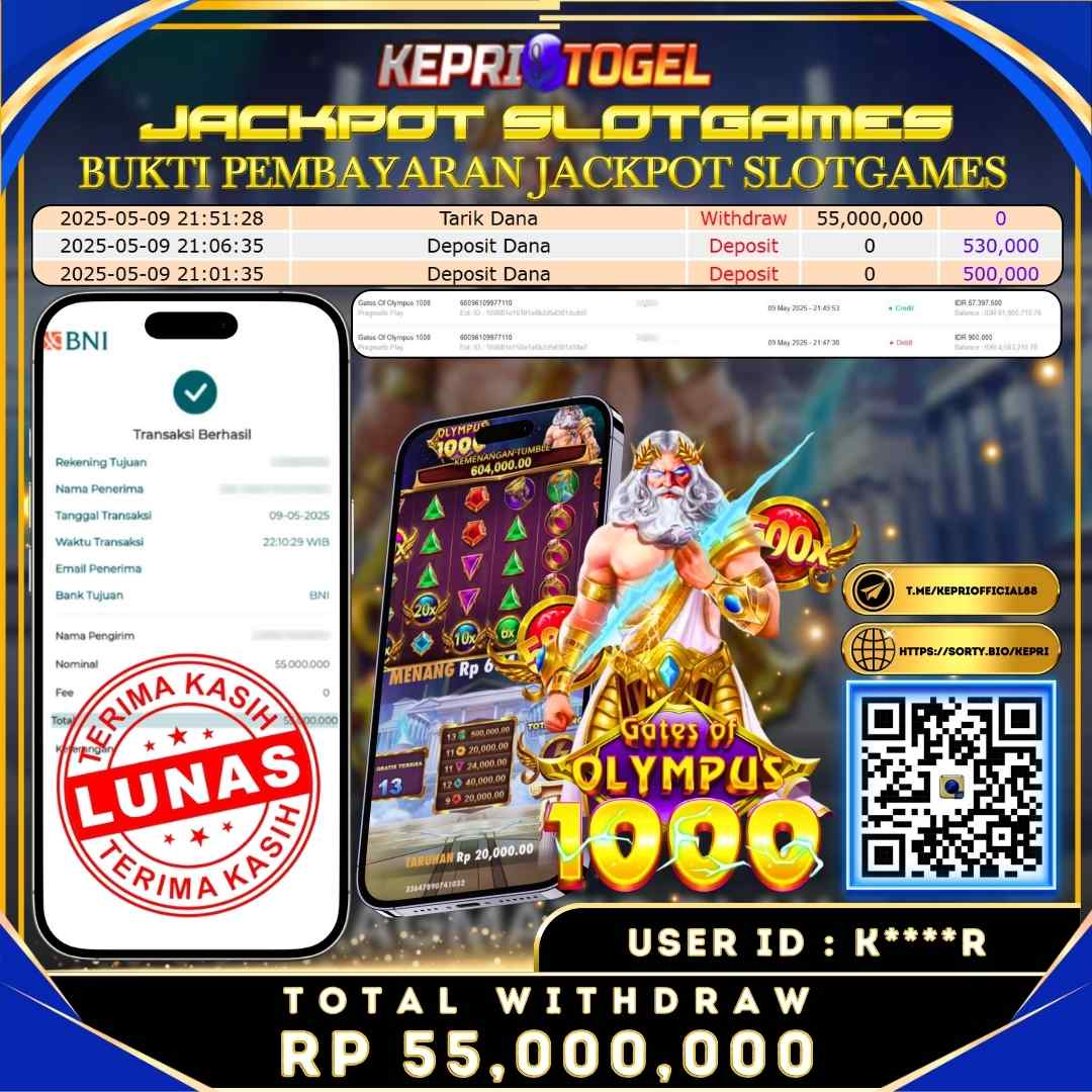 Selamat kepada UserId K****R telah berhasil mendapatkan kemenangan jackpot pada permainan Slot Gates Of Olympus 1000 Kepritogel sebesar Rp55,000,000,- . Kepritogel situs terpercaya sejak dulu hingga saat ini , Untuk kemenangan berapapun pasti akan kami bayarkan . Jangan ragu bermain di Kepri Togel . Kami pihak Kepritogel Menyampaikan terima kasih kepada seluruh member Kepri Togel yang telah Percaya dan setia Bersama kami bermain di Kepritogel hingga saat ini.
