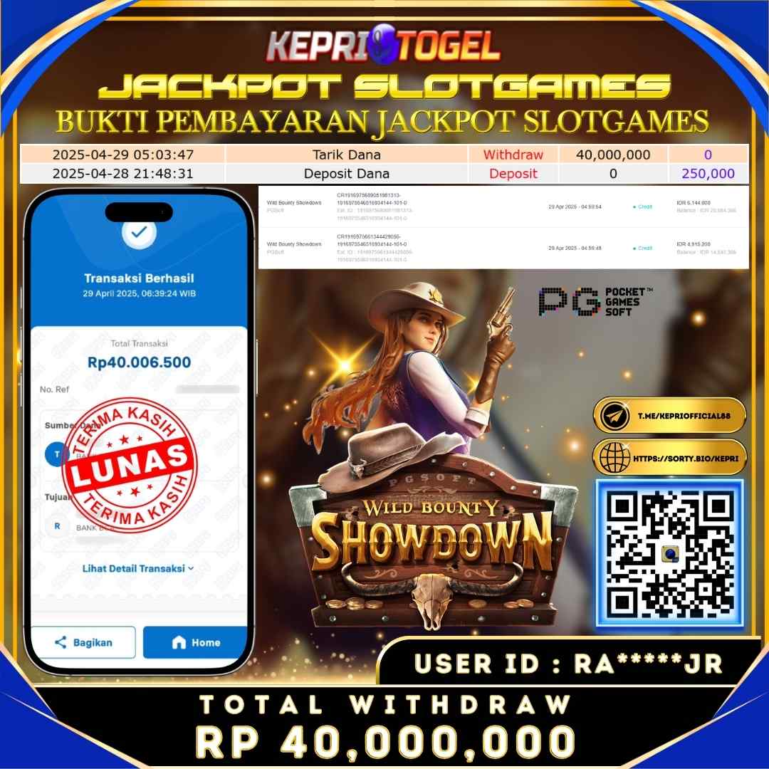 Selamat kepada UserId RA*****JR telah berhasil mendapatkan kemenangan jackpot pada permainan Slot Wild Bounty Showdown Kepritogel sebesar Rp40,000,000,- . Kepritogel situs terpercaya sejak dulu hingga saat ini , Untuk kemenangan berapapun pasti akan kami bayarkan . Jangan ragu bermain di Kepri Togel . Kami pihak Kepritogel Menyampaikan terima kasih kepada seluruh member Kepri Togel yang telah Percaya dan setia Bersama kami bermain di Kepritogel hingga saat ini.